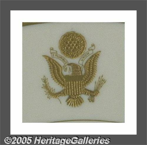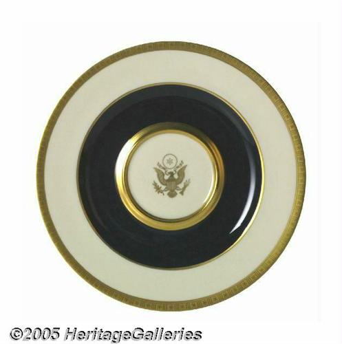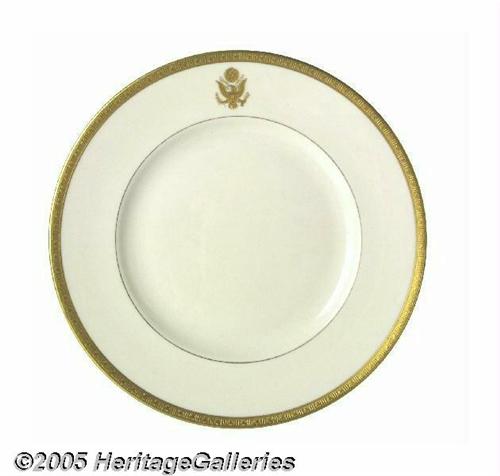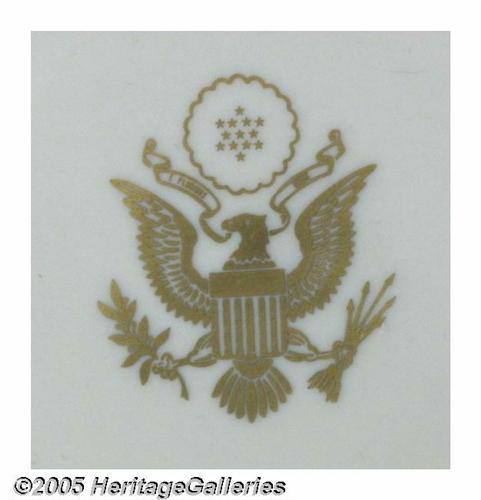 <B>Kennedy State Dining China</B></I> First Lady Jacqueline Kennedy was lauded for her interest in portraying the best in culture that the United States had to offer the world. From her "Tour of the White House" to her world travels, she showed grace. These three (3) plates were ordered by the Kennedy administration at her request to serve at State Department dinners. They measure 9" across and feature the Great Seal eagle on each. This is a unique opportunity to own these pieces of history. Lot:264