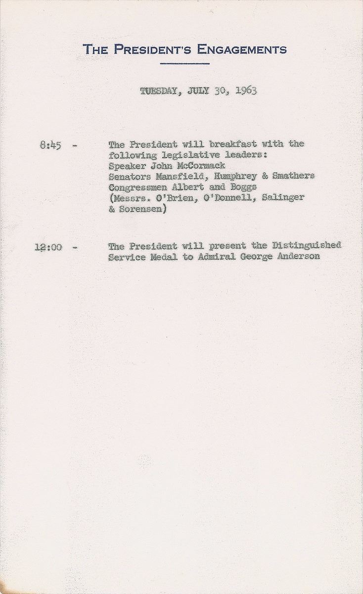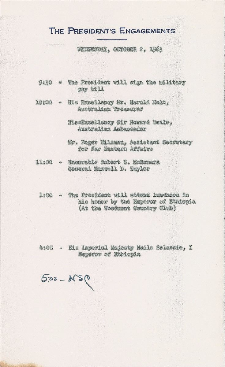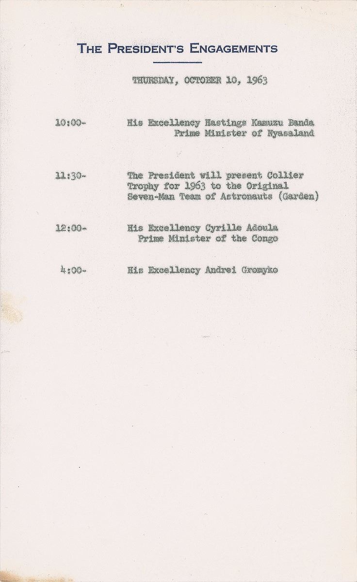 Three official carbon copy daily schedules, each one page, 5.75 x 9.25, “The President’s Engagements” letterhead on paper watermarked with the presidential seal, dated July–October 1963. Highlights from each include: October 10, 1963, “The President will present Collier Trophy for 1963 to the Original Seven-Man Team of Astronauts,” and a later meeting with the Soviet diplomat “His Excellency Andrei Gromyko”; October 2, 1963, “The President will sign the military pay bill,” meetings with Robret S. McNamara and General Maxwell Taylor, and later a luncheon and meeting with “His Imperial Majesty Haile Selassie I, Emperor of Ethiopia”; and July 30, 1963, “The President will present the Distinguished Service Medal to Admiral George Anderson.” In overall fine condition.
