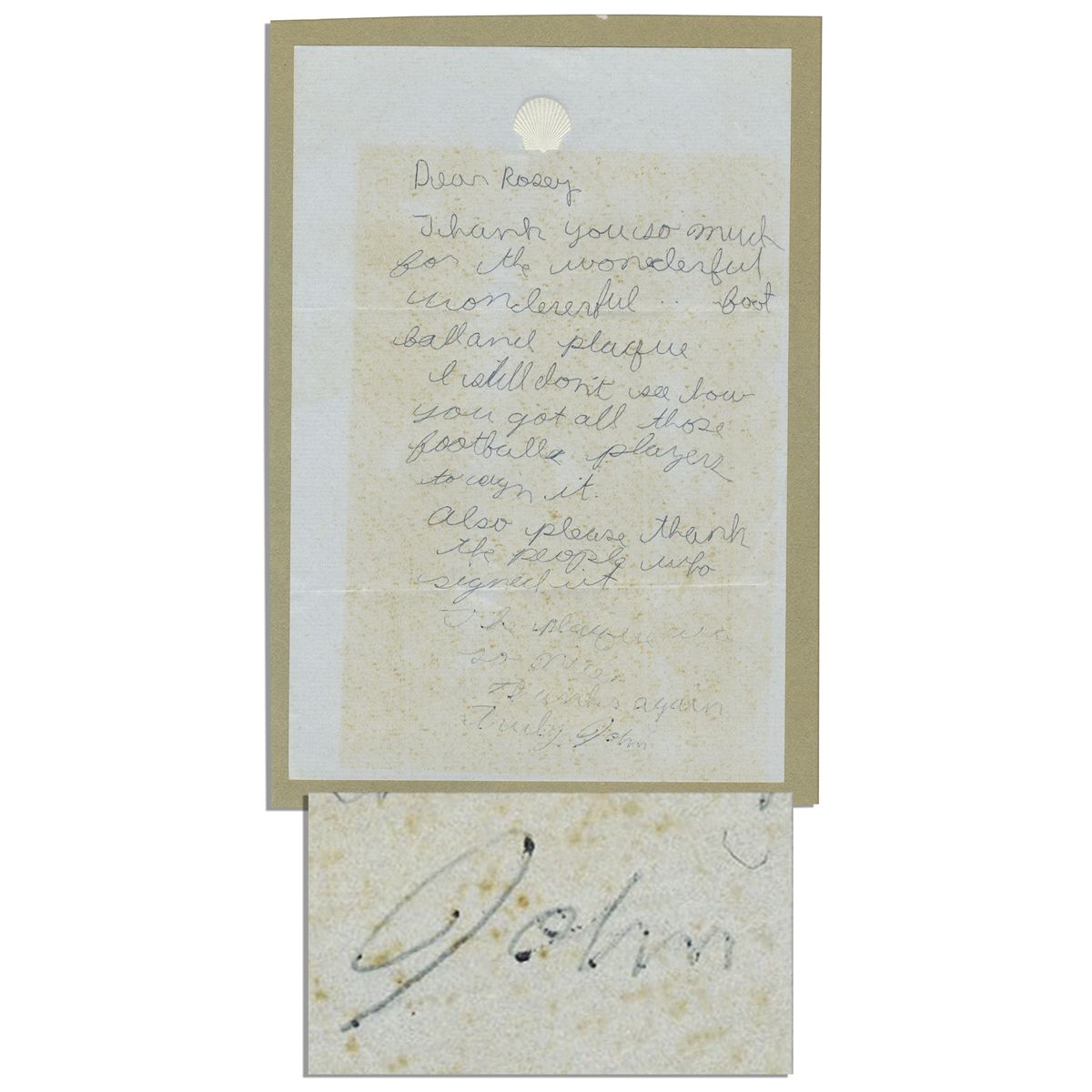 John F. Kennedy, Jr. autograph letter signed. Charming letter is to Roosevelt Greir, the Los Angeles Rams player who became the Kennedy family bodyguard who disarmed Sirhan Sirhan in the RFK assassination. Letter reads in full, ''Dear Rosey, Thank you so much for the wonderful wonderful football and plaque. I still don't see how you got all those players to sign it. Also please thank the people who signed it. The plaque is so nice. Thanks again, Truly John''. Sadly JFK, Jr. died in a plane crash with his wife at the age of 38. Undated letter runs 1pp. on pale blue stationery with a white embossed scallop shell design at the top. Measures 5.25'' x 7.5''. Mounted to a card to an overall size of 5.75'' x 8.25''. Some fading to text, foxing and toning over most of page, else very good.