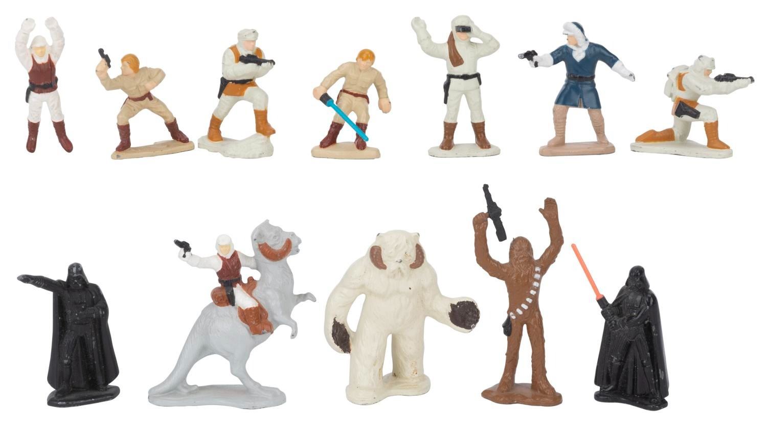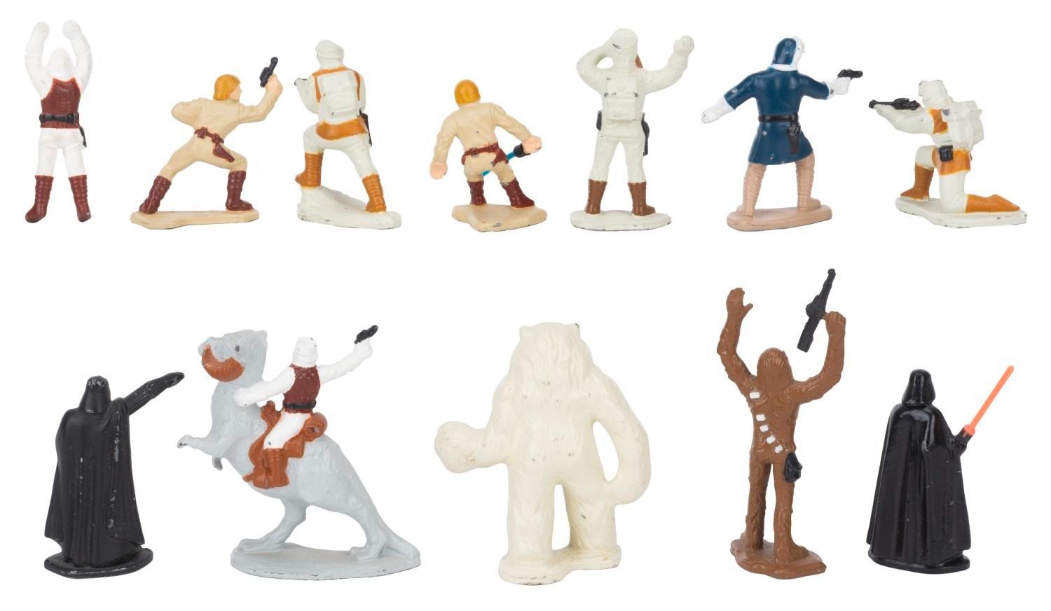 (Kenner, 1982) Twelve metal figures from the Kenner Micro Collection “Empire Strikes Back” sets released in 1982. Included are three Lukes (one meant to hang in a wampa cave), two Vaders, three rebel soldiers, Chewbacca, the wampa, and two of Han Solo with one riding a taun taun. Measuring up to 2.25” tall, the figures are in very good condition with some wear to paint from use and handling.