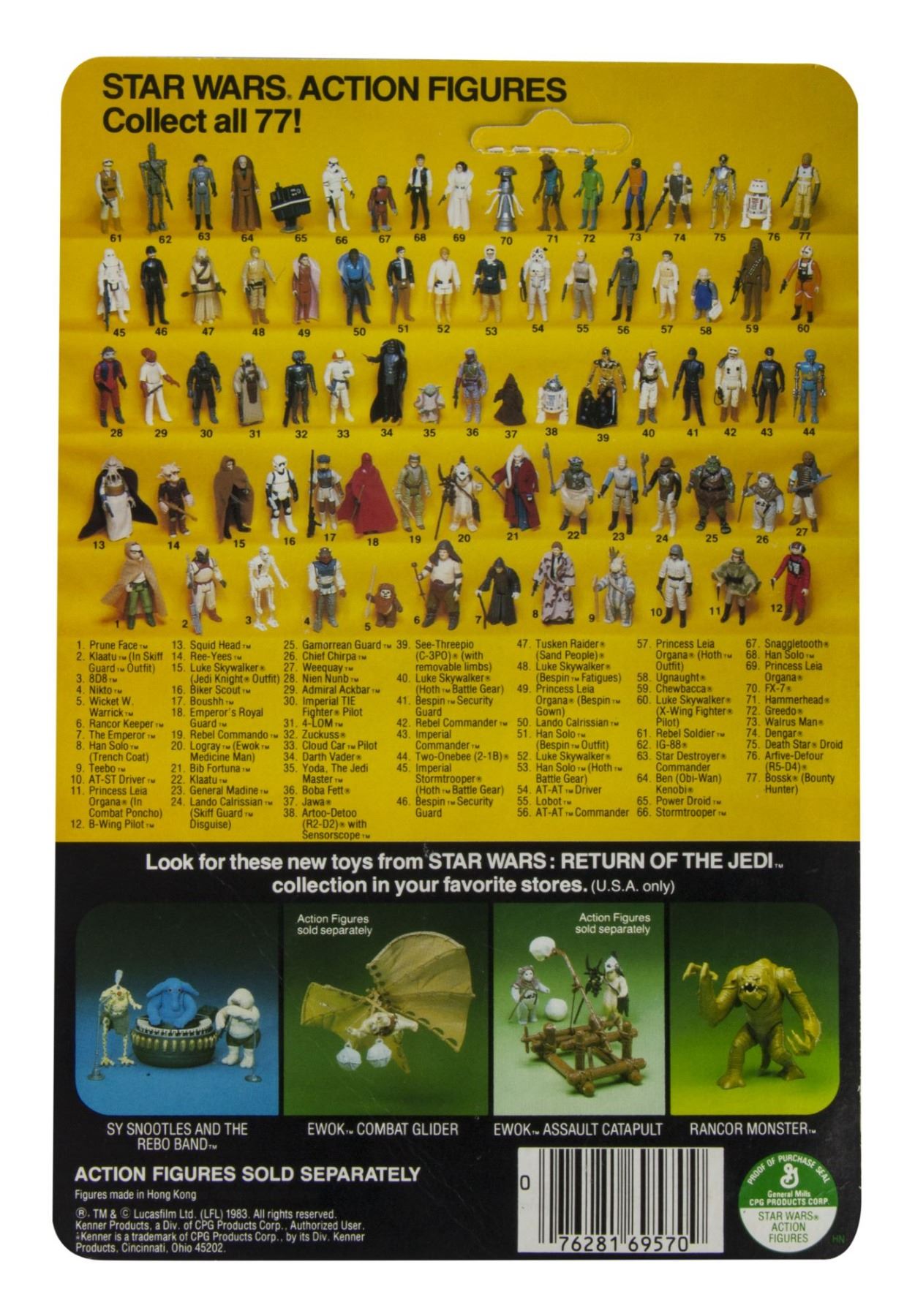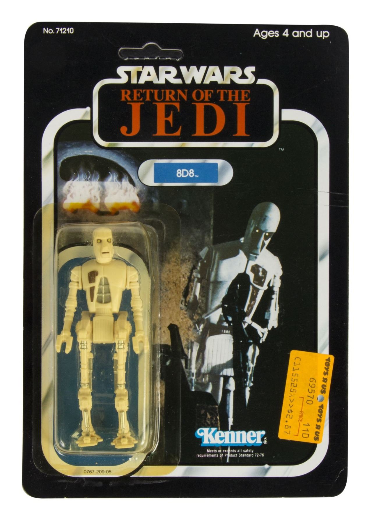 (Kenner, 1983) A rare 8D8 action figure created by Kenner for "Return of the Jedi". This figure is unopened in its original packaging and still retains its original Toys 'r' Us sales sticker in the bottom-right corner. The packaging measures 9"x6" and the condition is very good with some creasing to the cardboard backing.