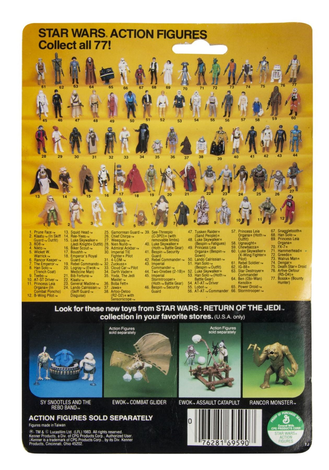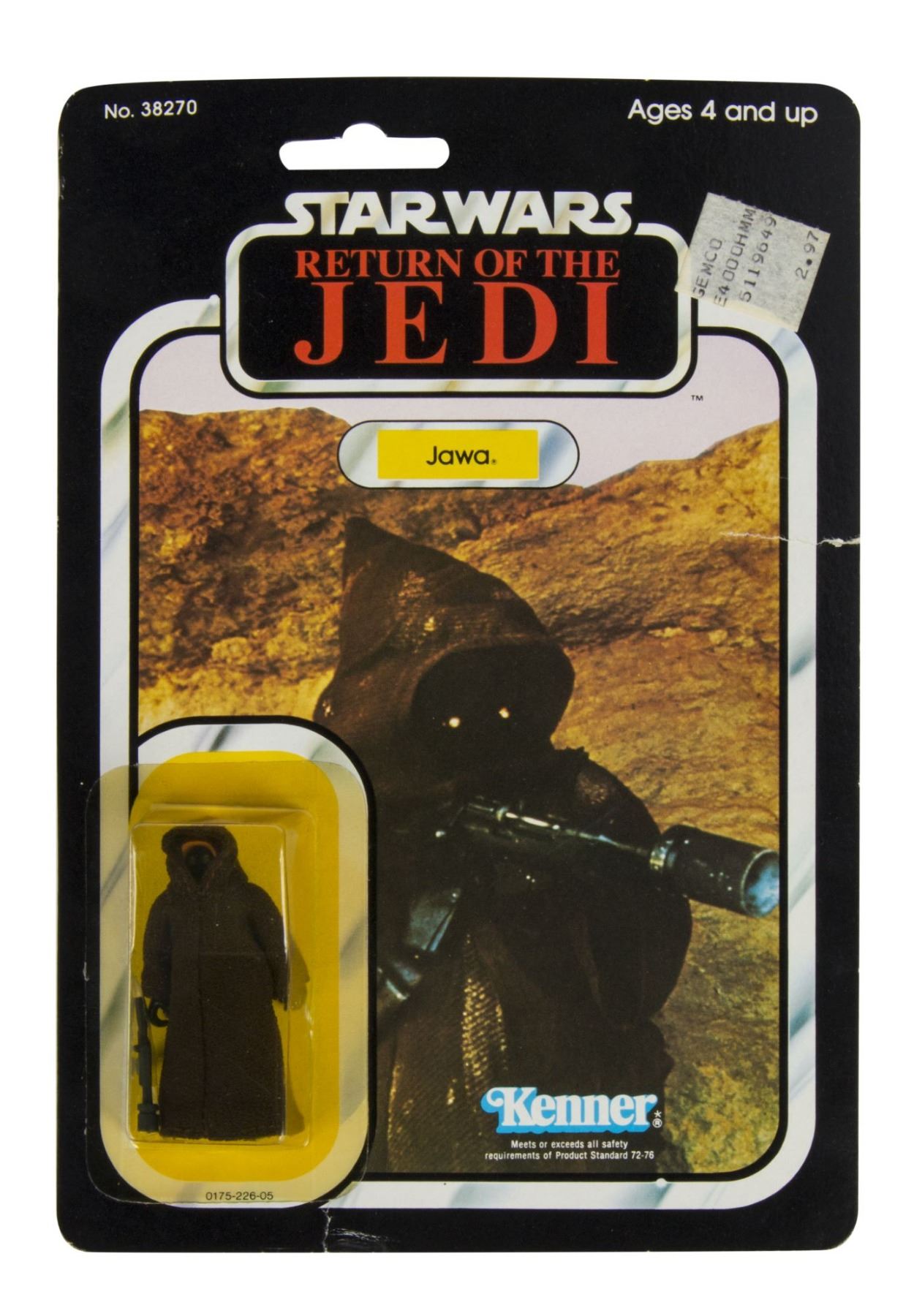 (Kenner, 1983) A rare Jawa action figure created by Kenner for "Return of the Jedi". This figure is unopened in its original packaging and still retains its original Gemco sales sticker on the cardboard backing. The packaging measures 9"x6" and the condition is very good with a thin 1" tear on the right side of the cardboard backing, as well as a small 0.25" tear on the bottom-edge of the backing.