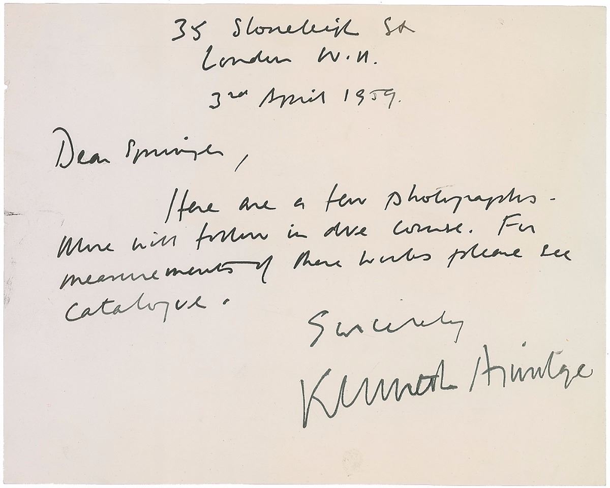 British sculptor (1916–2002) known for his semi-abstract bronzes. ALS, one page, 10 x 8, April 3, 1959. Letter to German art dealer Rudolph Springer, in full: “Here are a few photographs. More will follow in due course. For measurements of these works please see catalogue.” A few tiny dings and edge tears, slight soiling to left edge, and slight feathering to signature, otherwise fine condition.