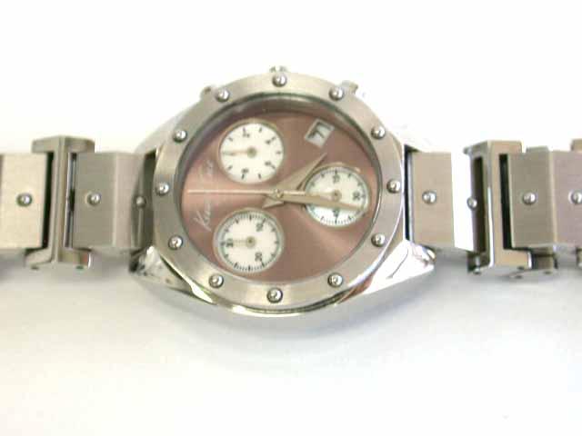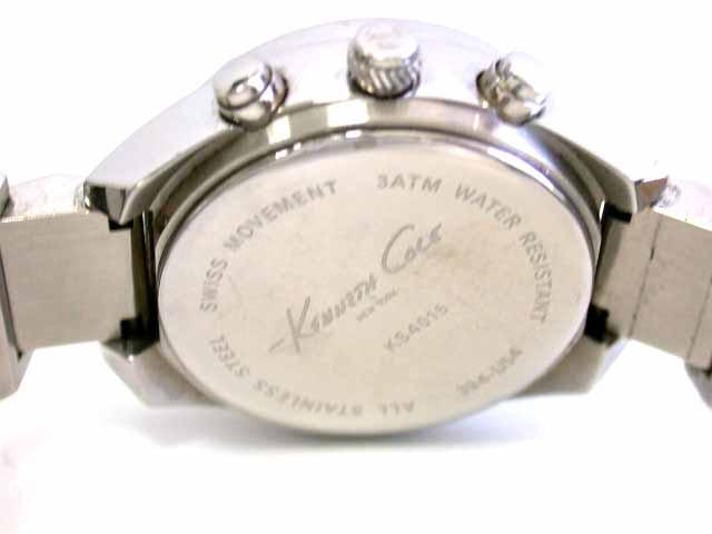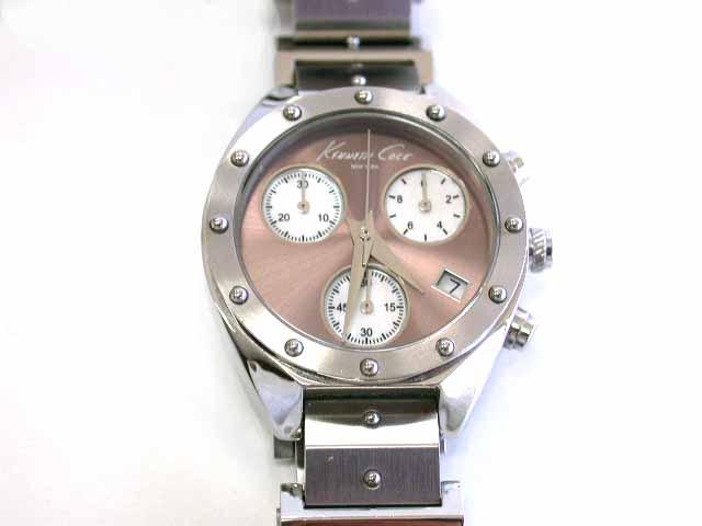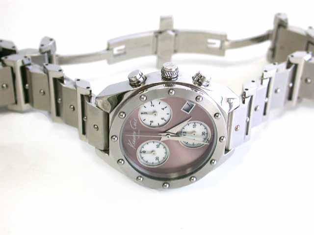 This is a Kenneth Cole Women Chronograph Bracelet Watch. The watch has a quartz movement, stainless steel case and chronograph and date functions. It is also water resistant to 3 ATM.