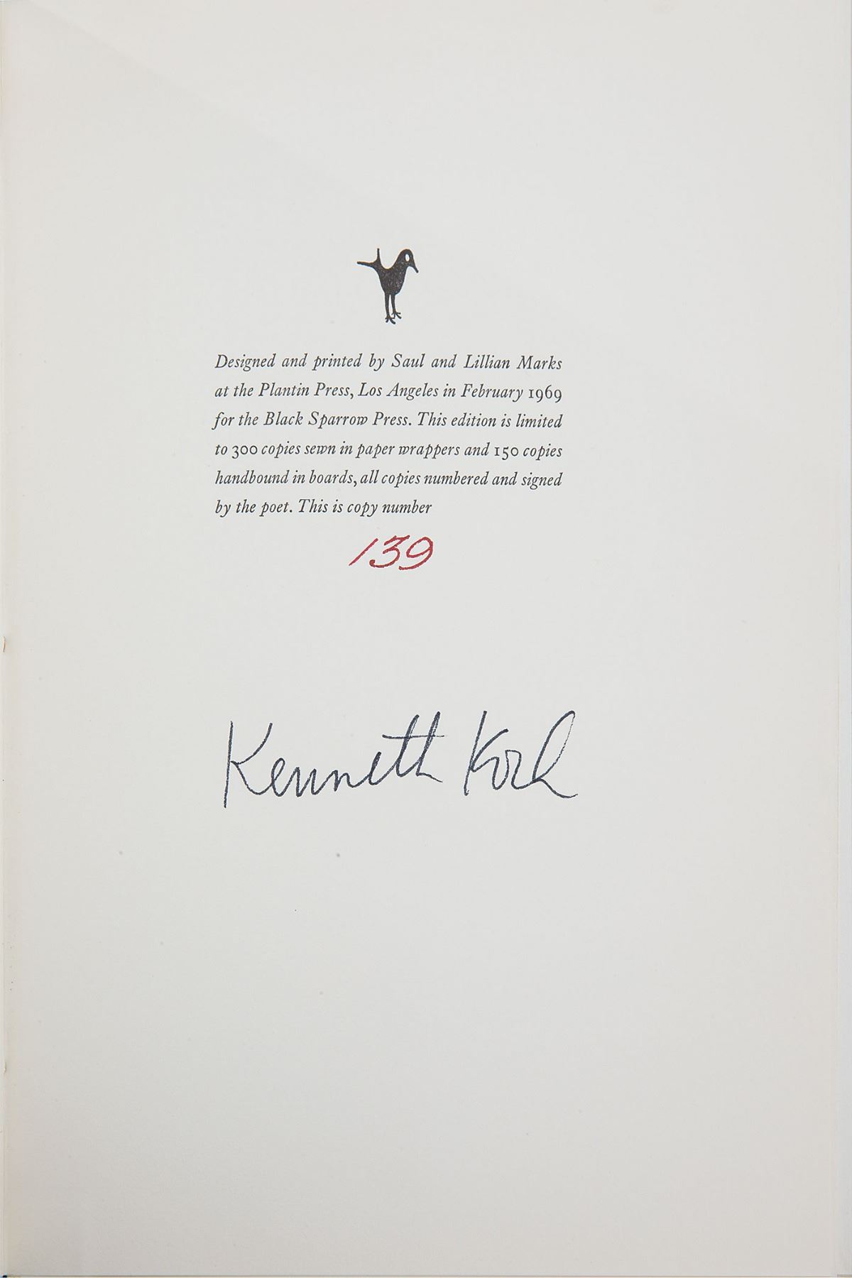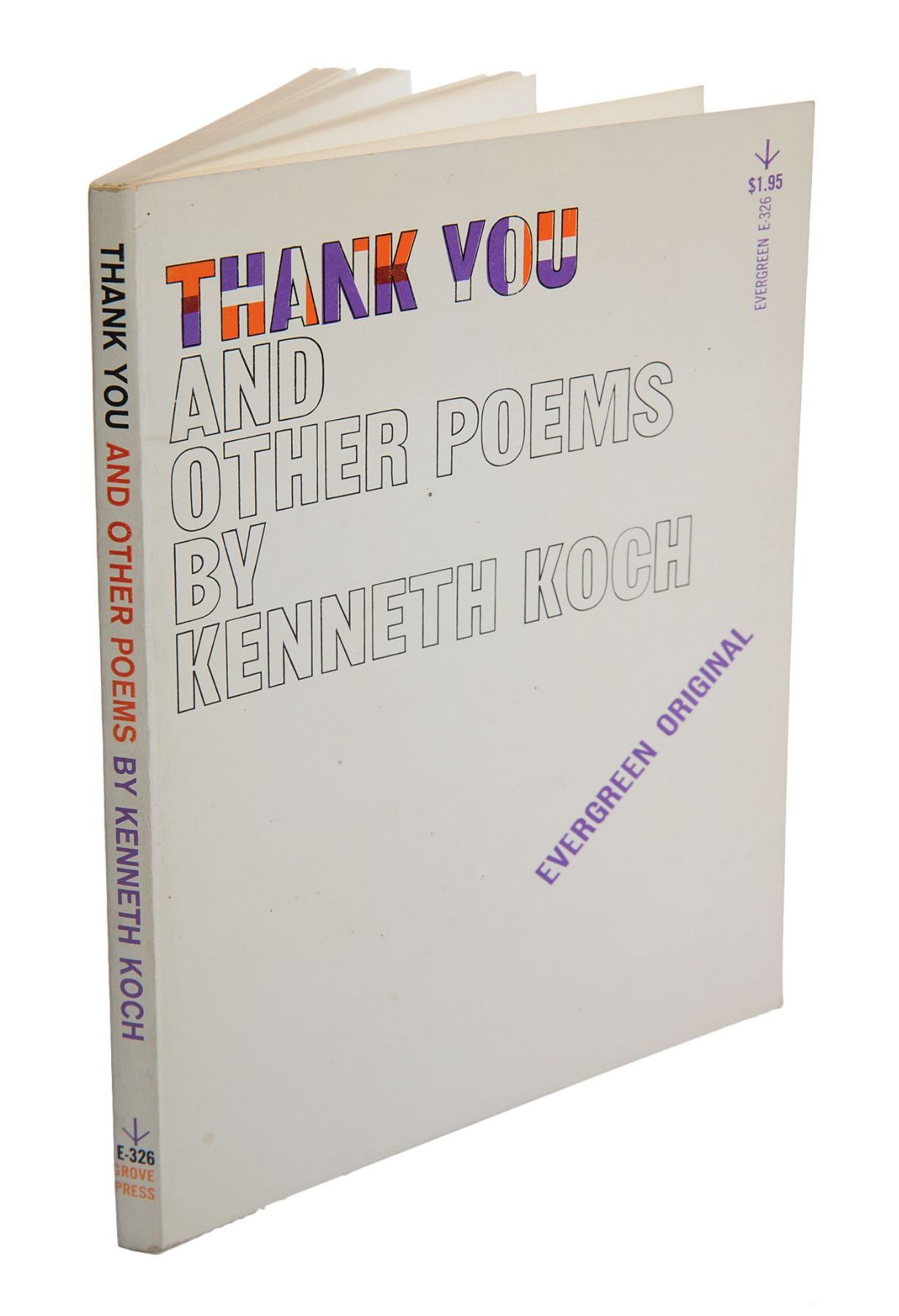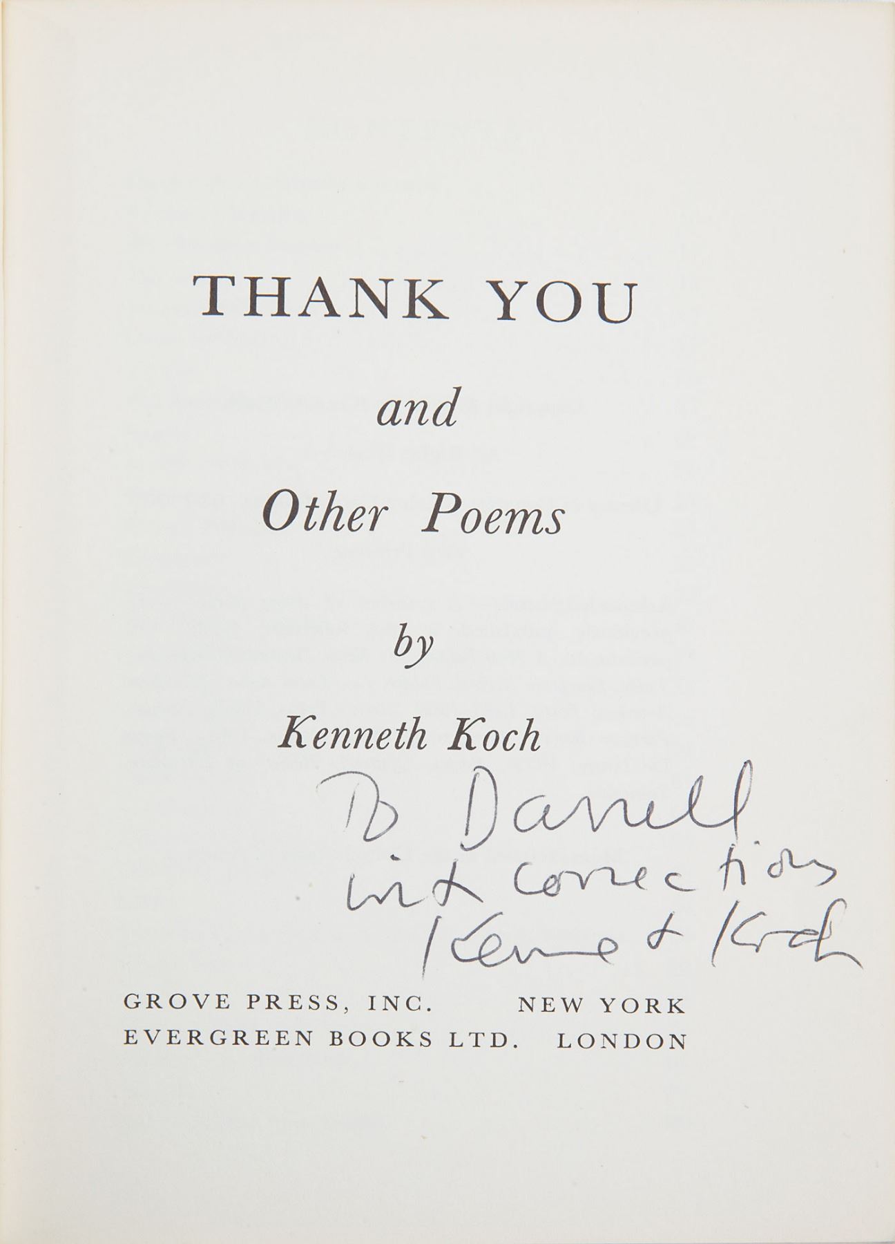Group of three books signed by Kenneth Koch: a limited edition softcover booklet entitled Poems from 1952 and 1953, numbered 54/300, published by the Black Sparrow Press in 1968, signed on the colophon in black ink by Koch; a limited edition hardcover book entitled Sleeping with Women, numbered 139/150, published by the Black Sparrow Press in 1969, signed on the colophon in black ink by Koch; and a softcover first edition book entitled Thank You and Other Poems, published by Evergreen Books in 1962, signed and inscribed on the title page in black ink by Koch. In overall fine condition.