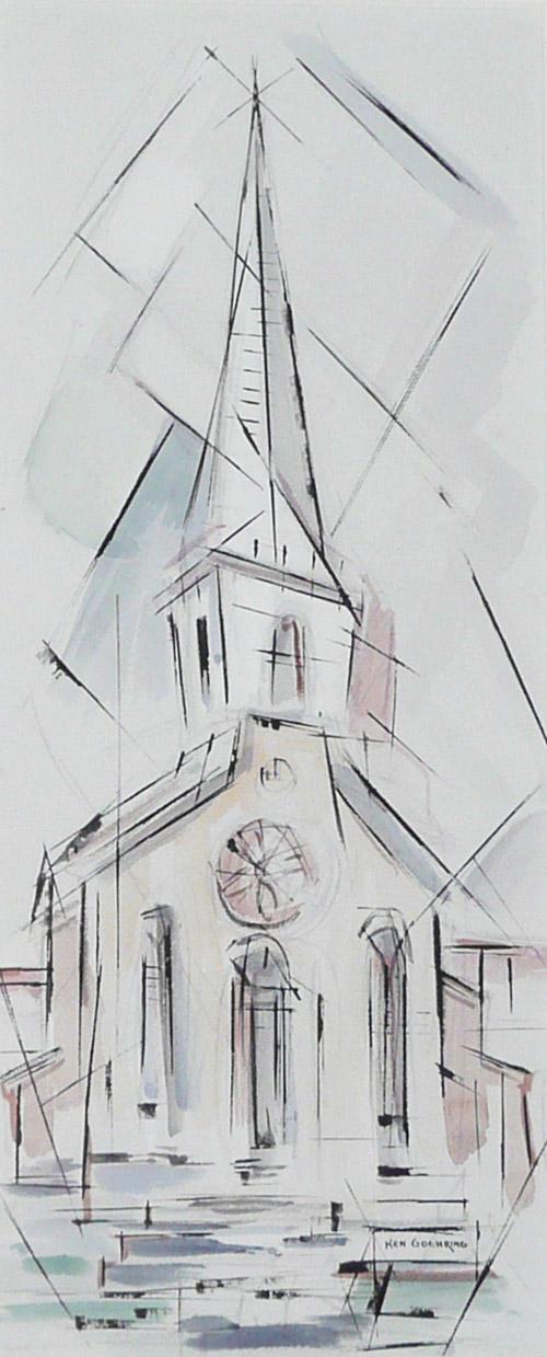 Kenneth O. Goehring (1919-2007) Mixed Media Church Signed lower right 12" x 5"