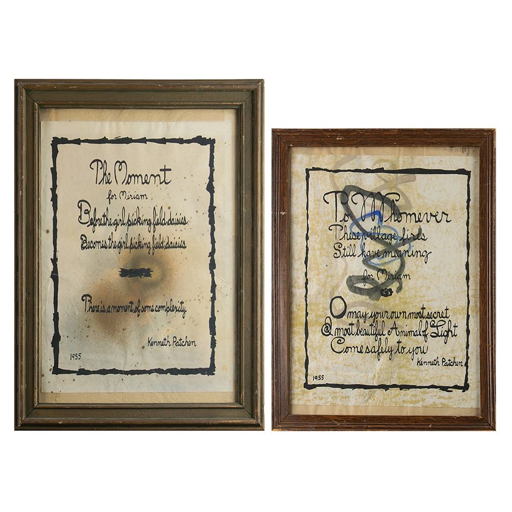 - Two hand-colored silkscreen broadsides of Patchen's 'picture-poems,' entitled "The Moment" and "To Whomever." Both framed.