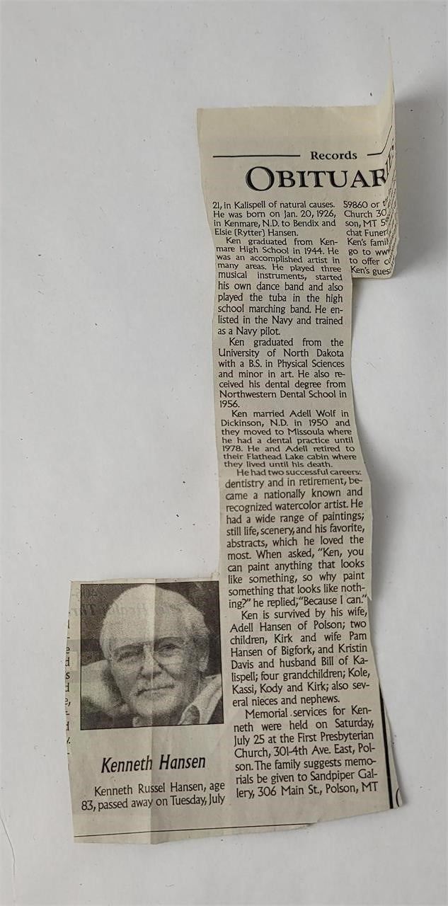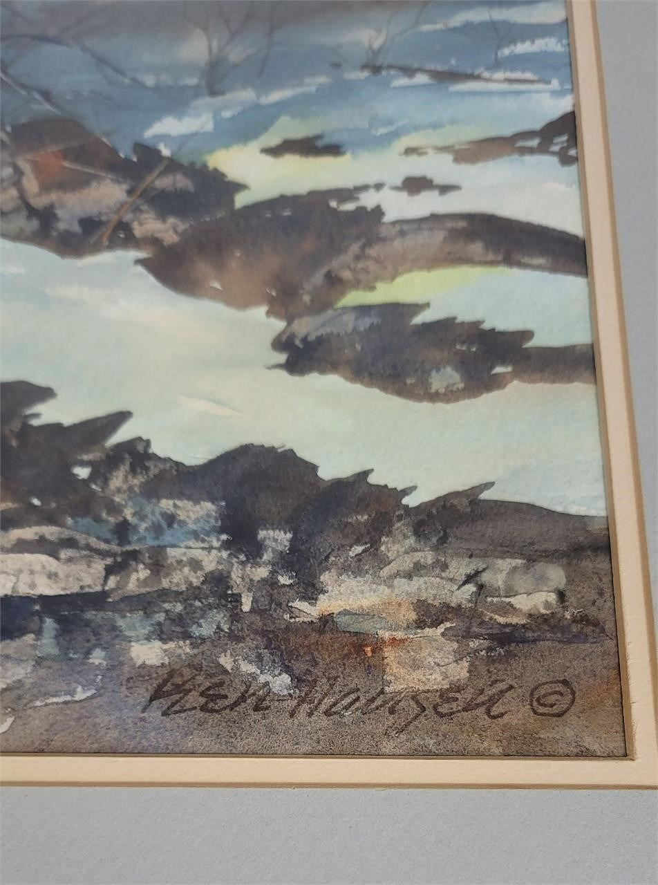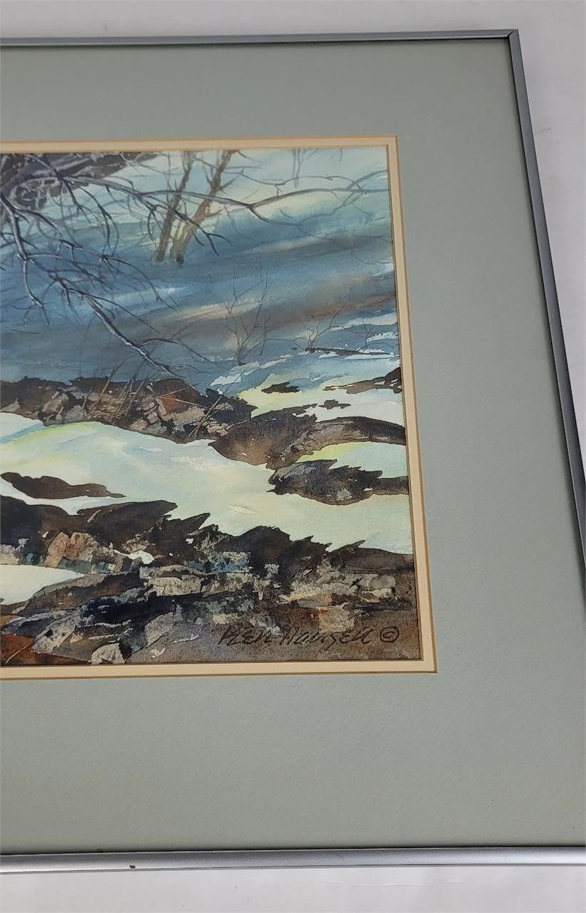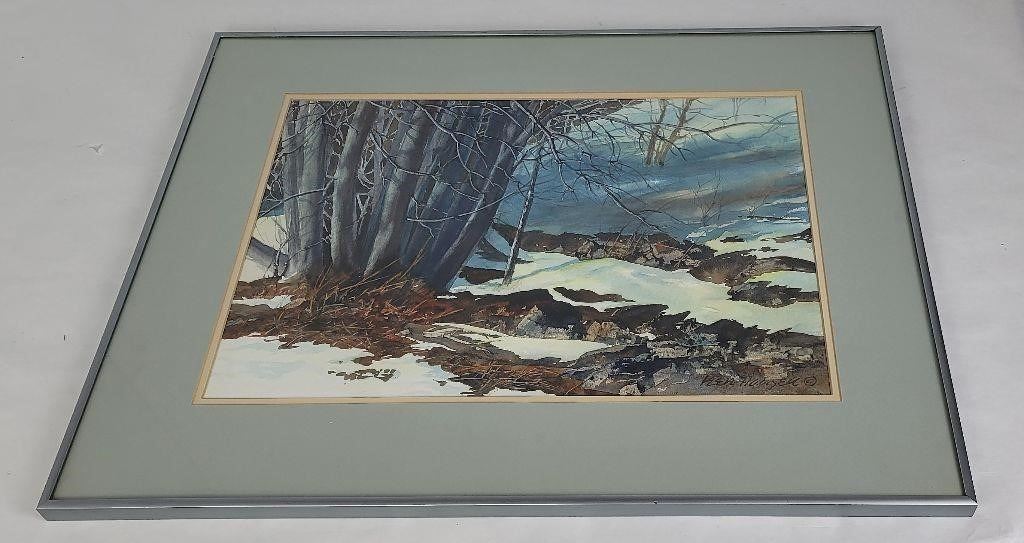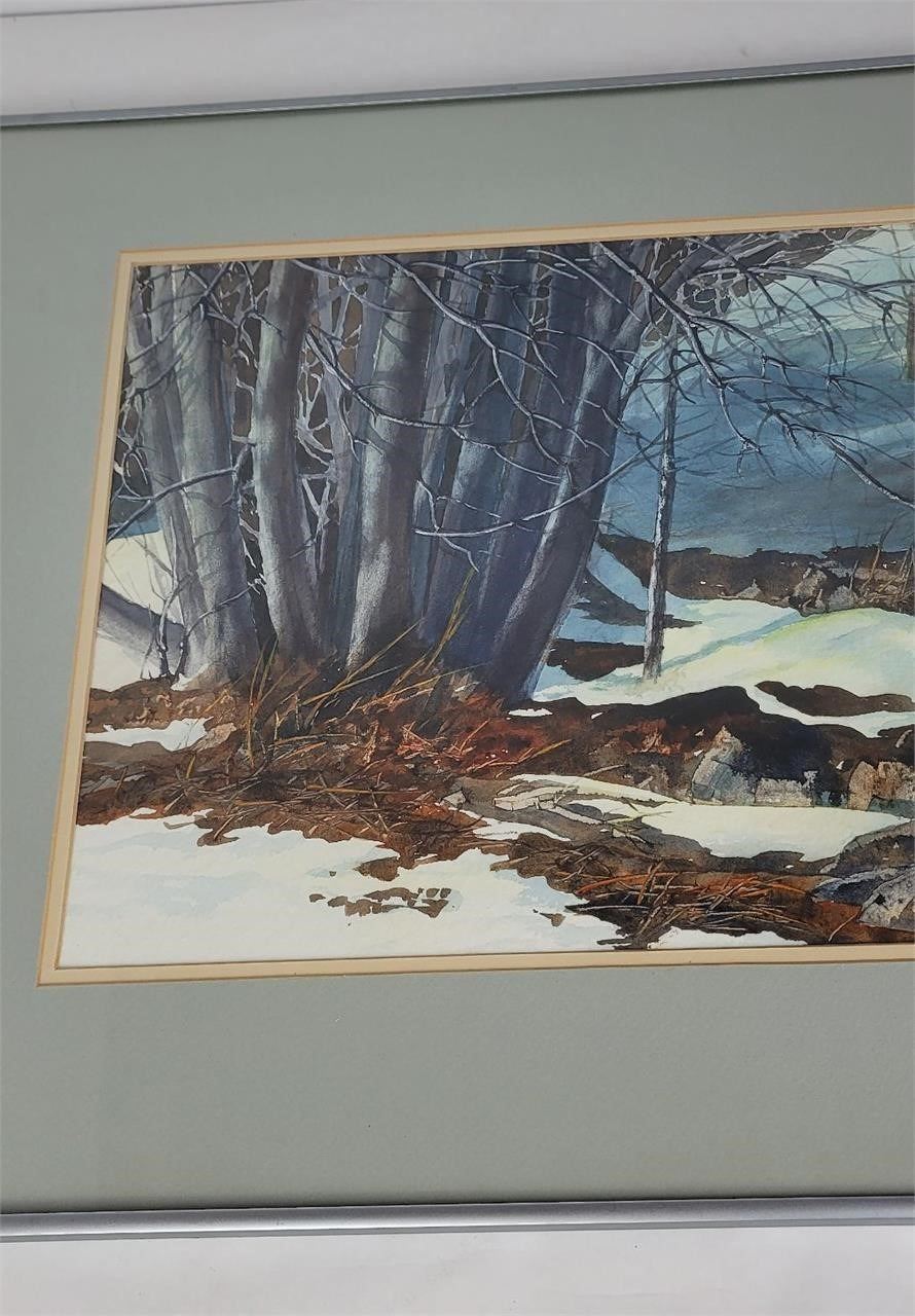 Kenneth Russel Hansen (Montana, 1926-2009). Montana association of Watercolor Artists. Forest scene in winter. Framed it measures 20" by 26".