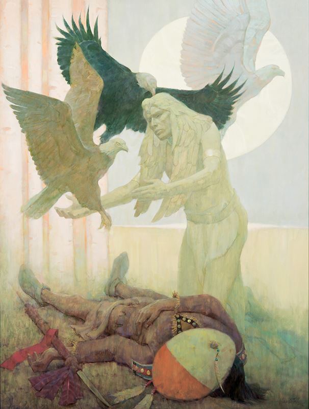 A fallen warrior, spear at his side, shield shielding his face, lies at an acute angle at the bottom of Ken Riley’s Wings for the Spirit. He is the occasion for the painting, but not its subject. Above, an eagle spirit holds his hands out to the warrior’s spirit, spirit meeting spirit, to bear it to the moon (or is it the sun?) where a totemic eagle holds sway. Interestingly, the blue square that dominates the top right of the picture, with the luminous disc and flying eagle, when you see it beside the four birches at left, and the pale pastel orange between them, the whole almost looks like the flag of an Indian nation. The spirit bearer is, of course, a Native American version of the Norse shield maiden, a Valkyrie who takes the warrior’s soul to Valhalla.