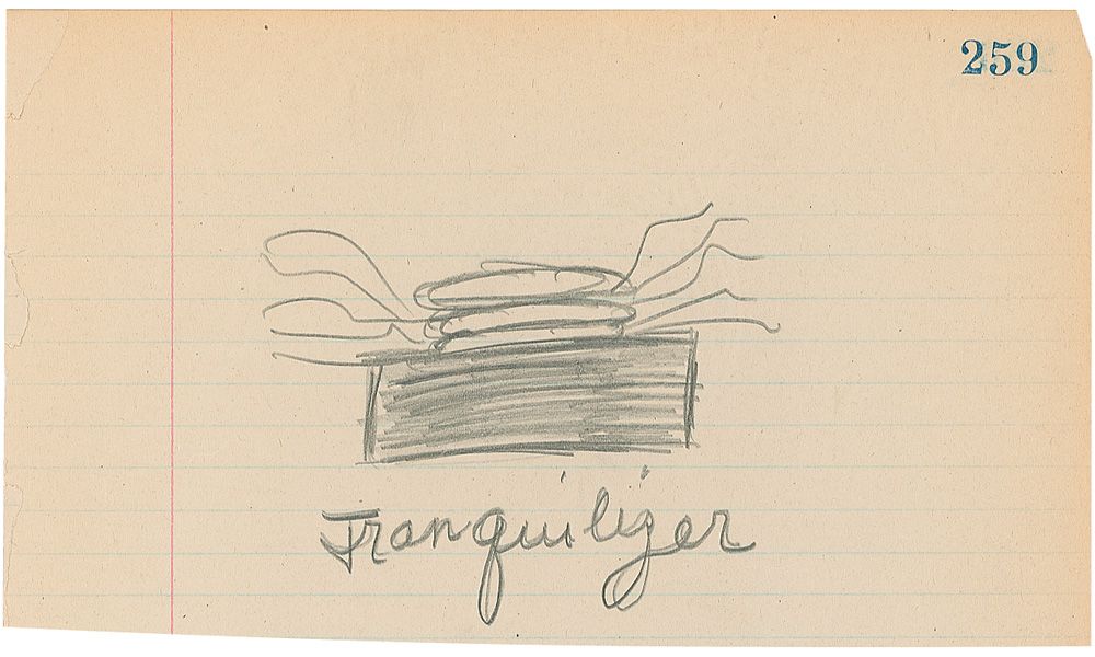 Set designer and electrical special effects creator (1896–1984) whose work appeared in more than 100 films and television shows including Frankenstein, The Wizard of Oz, and The Munsters. Original unsigned pencil sketch of a “Tranquilizer” on an off-white 7.5 x 4.5 lightly-lined sheet. In fine condition, with some mild toning, small stamp to top right, and Strickfaden tracing over the title.
