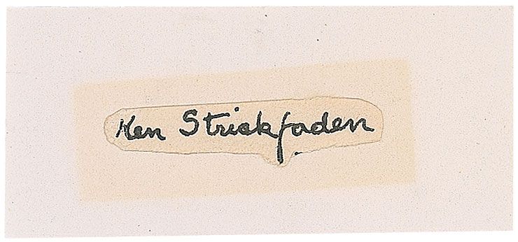 Set designer and electrical special effects creator (1896–1984) whose work appeared in more than 100 films and television shows including Frankenstein, The Wizard of Oz, and The Munsters. Crisp and precise ink signature, “Ken Strickfaden,” on an off-white .75 x .25 slip affixed to a 2 x 1 off-white slip. In very fine condition.