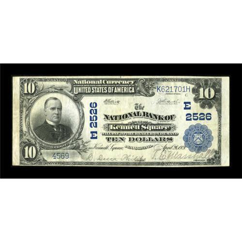 <B>Kennett Square, PA</B></I> - $10 1902 Plain Back Fr. 633 <B>The NB of Kennett Square</B></I> Ch. # (E)2526<BR> A seldom seen Chester County note in large size, particularly this nice. Sharp <B>Very Fine,</B></I> with clear signatures and plenty of eye appeal. <BR><BR><b>Shipping:</b> Coins & Currency (<a target="_blank" href="http://www.heritageauctions.com/common/shipping.php">view shipping information</a>)