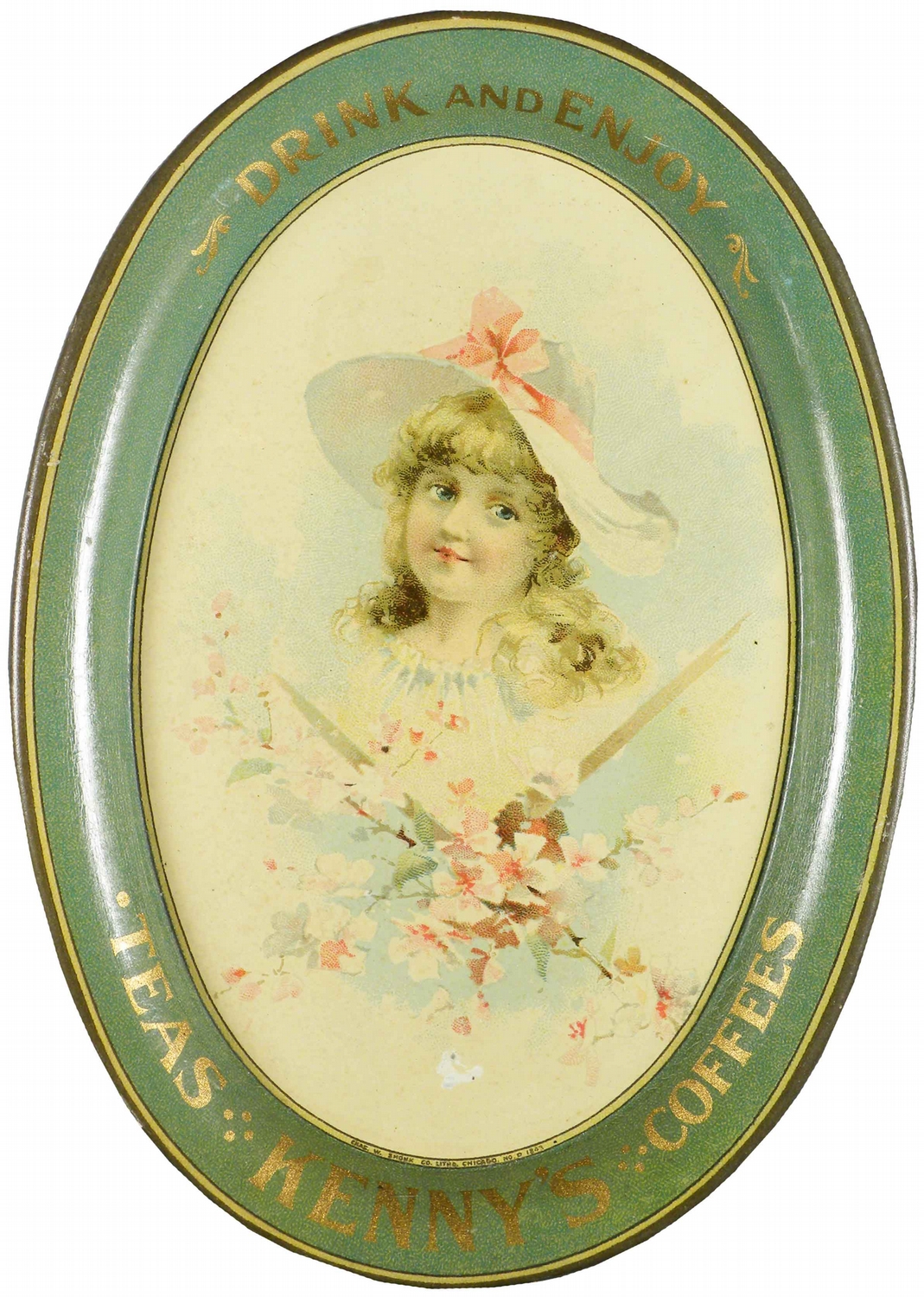 Kenny's Teas & Coffees Tin Tip Tray. Drink and Enjoy. Slight discoloration at 6:00 otherwise excellent condition. 4 3/8 X 6 1/8 inches.