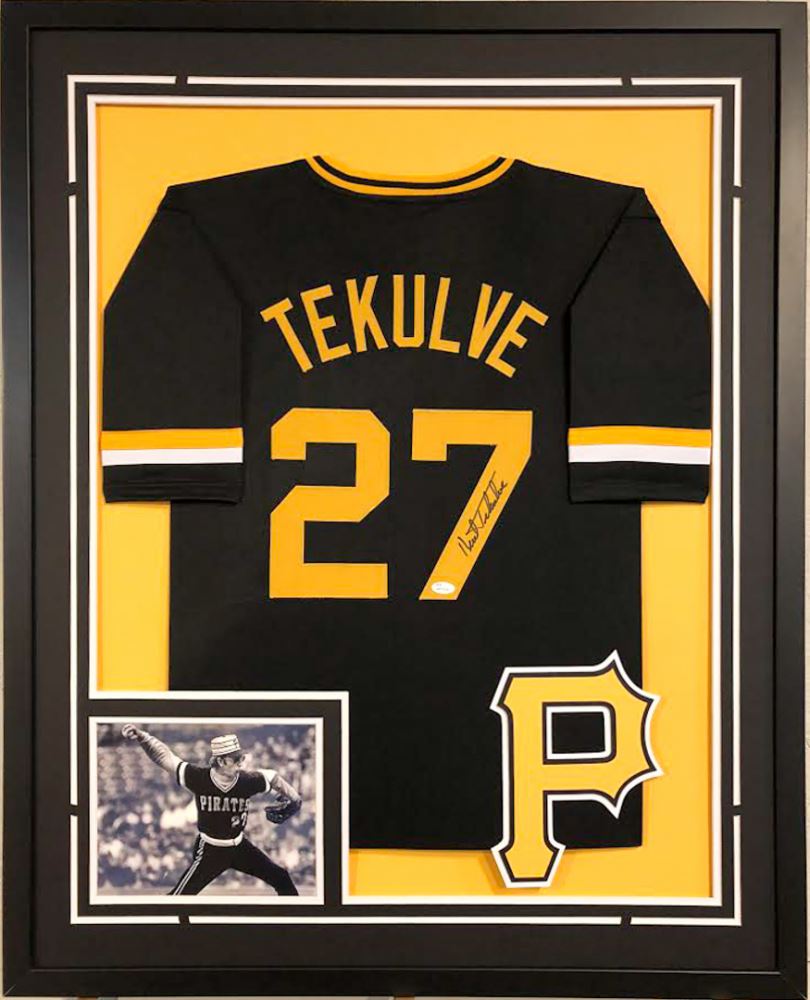 Custom frame measures approximately 34" x 42" in size and features a jersey which has been hand-signed in black felt-tip pen by Kent Tekulve.