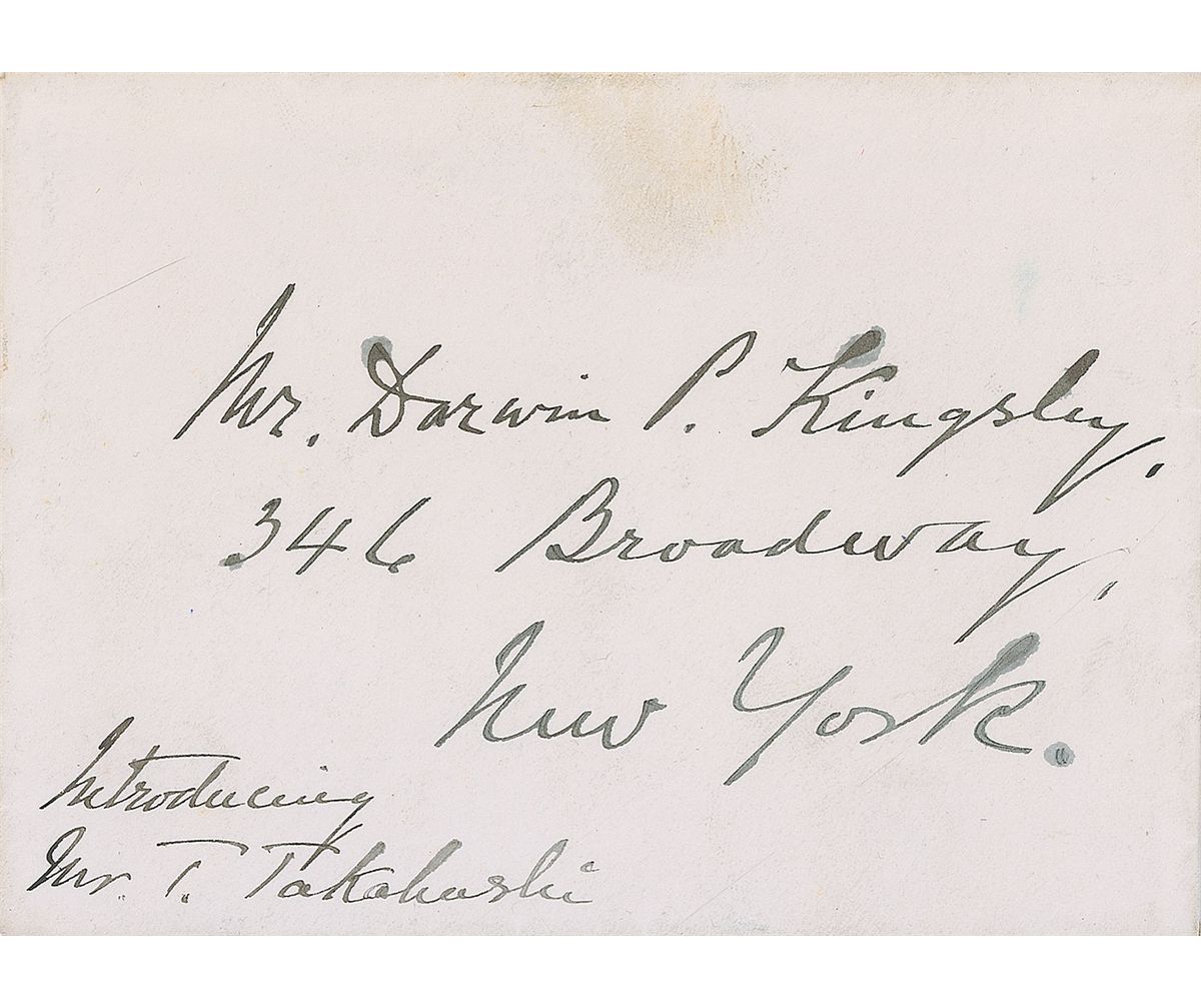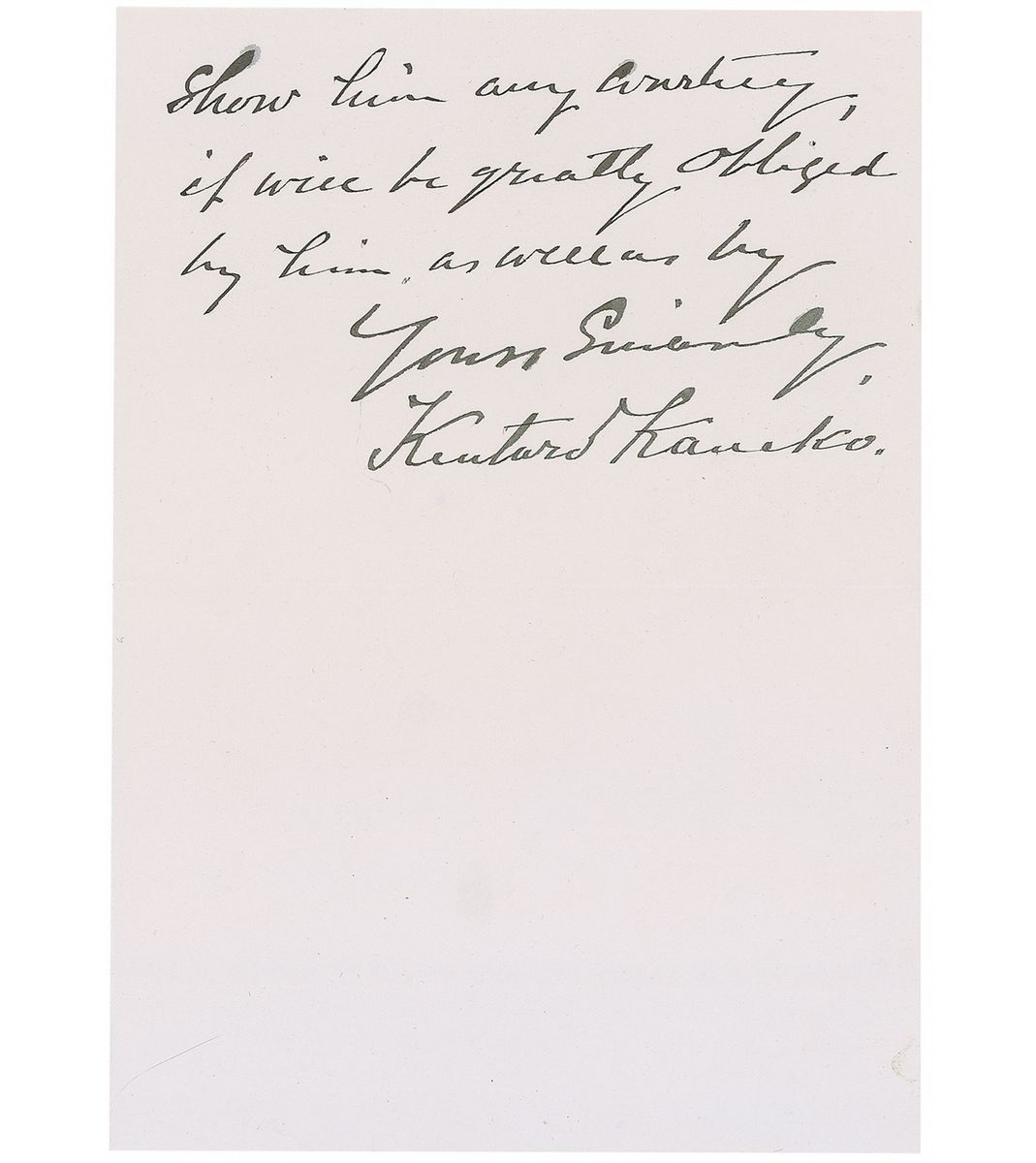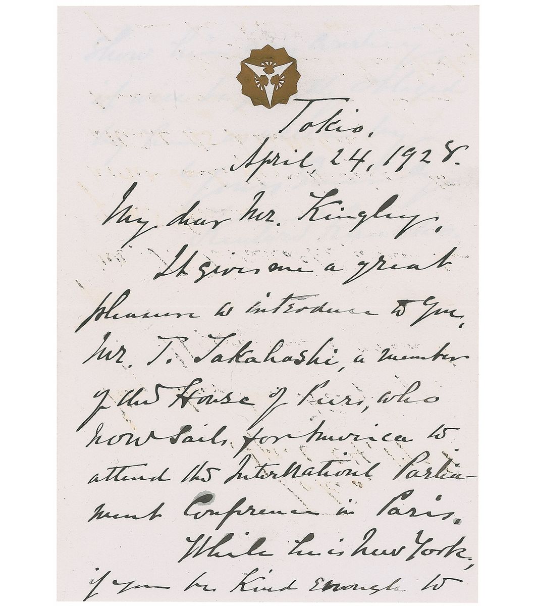 Statesman and diplomat (1853–1942) in Meiji period Japan who was a strong proponent of good diplomatic relations with the United States. ALS in English, two pages on two adjoining sheets, 5.25 x 7.25, official letterhead, April 24, 1928. Letter to Darwin P. Kingsley. In part: "It gives me great pleasure to introduce to you, Mr. T. Takahashi, a member of the House of Peers, who now sails for America to attend the International Parliament Conference in Paris.” In fine condition, with mirroring to ink. Accompanied by the original mailing envelope, addressed in Kaneko’s hand.