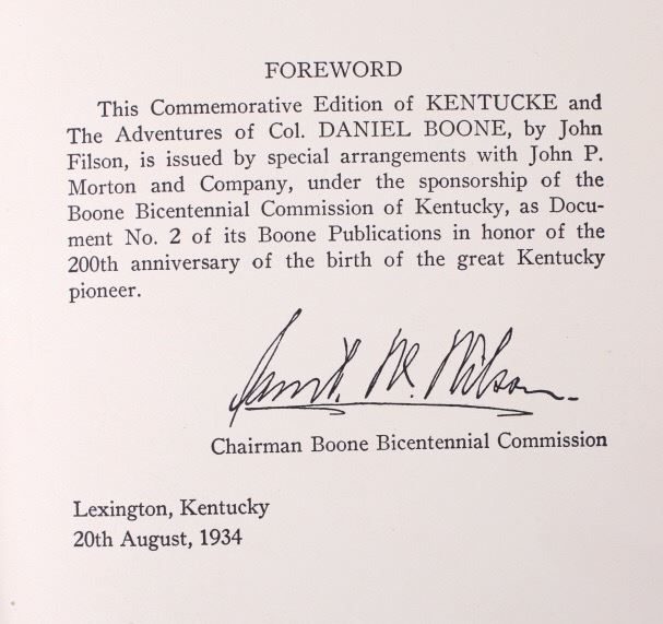 For your bidding pleasure is this book Kentucke and Daniel Boone 1784 by John Filson. Although this is not a first edition, by no means is this a common book. Only 1200 copies were made of this edition of Kentucke 1784, with a printed image of the original map; which was the first of its kind to capture the idealistic expansion westward of Col. Daniel Boone and the territory now known as Kentucky. The book is in good condition with extremely minor marks to cover and a couple age stains to cover and pages alike. The copyright is from John P. Morton & Company in 1934, but the book has an exact reprint from its original 1784 copy along with the map in the first few pages of the book. The book measures 8 3/4" x 5 3/4".