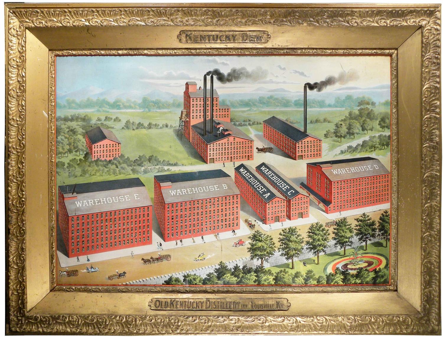 Kentucky Dew Tin Sign. Factory Image of Old Kentucky Distillery, Louisville, KY. Large and impressive sign in magnificent frame. Excellent condition. 49 X 37 1/2 inches overall.