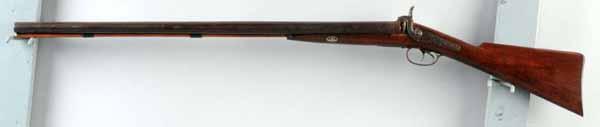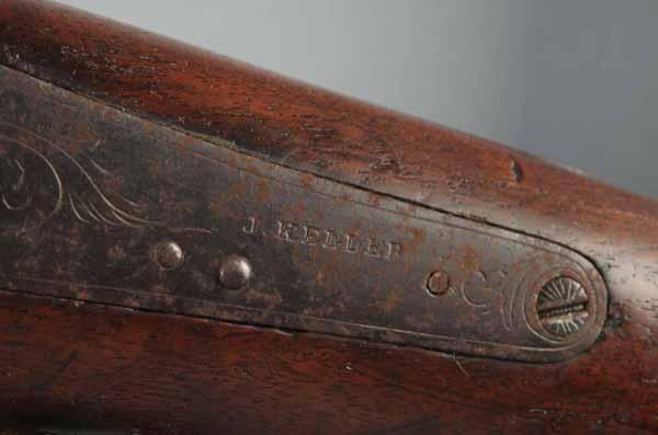 Description OL: 48". BL: 32". Double barrel shotgun with percussion locks. Marked "J. Keller of Carlisle". Condition (Fair).