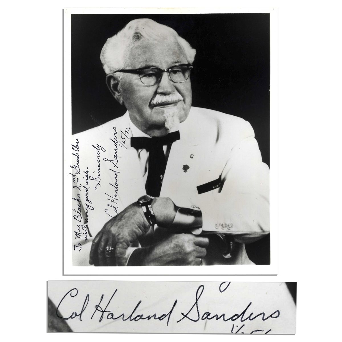 Colonel Harland Sanders signed and inscribed black-and-white photo. Sanders started perfecting his ''secret recipe'' for his fried chicken in 1930 in Corbin Kentucky, with a recipe that continues to spurn franchise after franchise worldwide. Here, the Kentucky Fried Chicken founder poses in his trademark look, including a mustache and goatee, black bowtie and white coat. Inscribed in black ink along lower left: ''To Mrs. Blacks 2nd Grade Class / with every good wish -- Sincerely / Col. Harland Sanders / 1/25/72''. Glossy photo measures 8'' x 10'' with very minor toning to border, else fine.