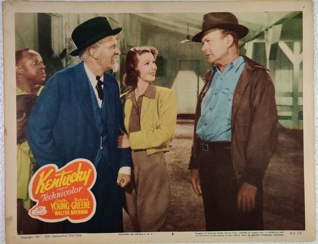 Kentucky (20th Century Fox, 1938) lobby card. Drama, Romance. Starring Loretta Young, Richard Greene, Karen Morley, Walter Brennan, Douglass Dumbrille, Moroni Olsen. Directed by David Butler. Some edge wear, some creases, some tearing, pin-holes. Fine. (11"x14").