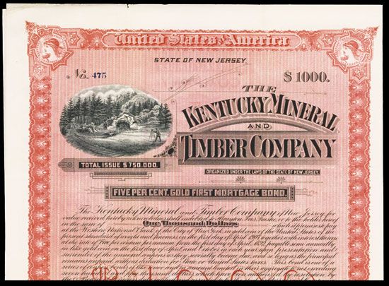 Kentucky, 1892, $1000, 5% 1st Mort. Gold Bond, Issued and uncancelled, Black on red border and underprint, Surveyor with mountains, tress and railroad tracks on top left next to title, XF condition, coupons attached, Scarce and attractive certificate.