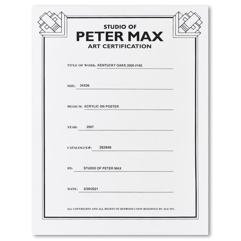 "Kentucky Oaks" is a one-of-a-kind acrylic mixed media on paper, hand signed by Peter Max. This piece comes custom framed. Includes Certificate of Authenticity from Peter Max Studios! Measures approx. 47.5" x 35.5" (with frame), 35" x 23" (image).