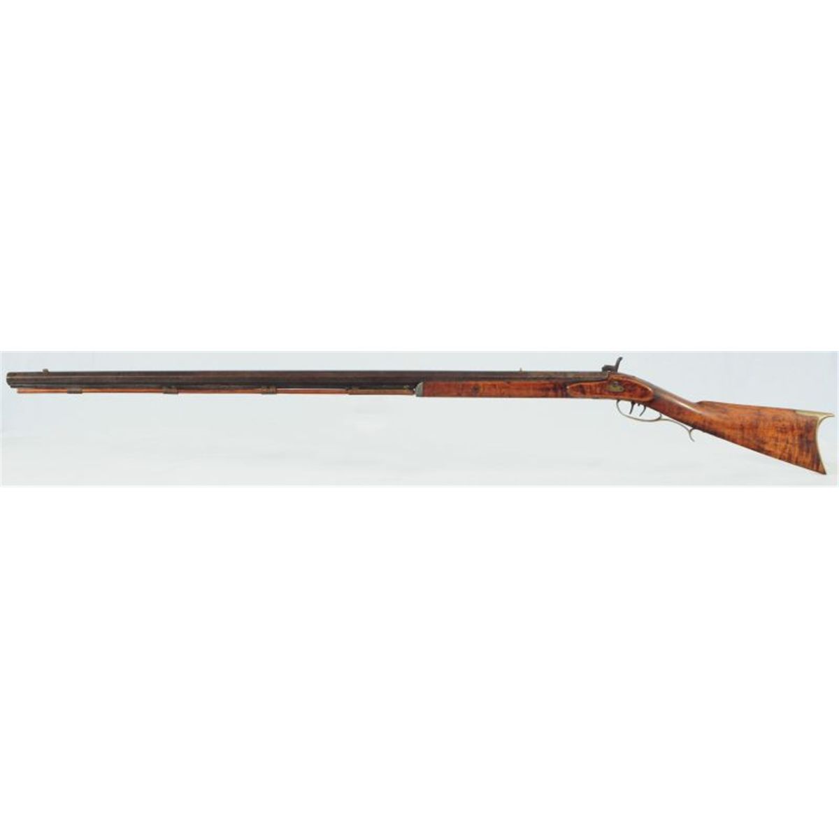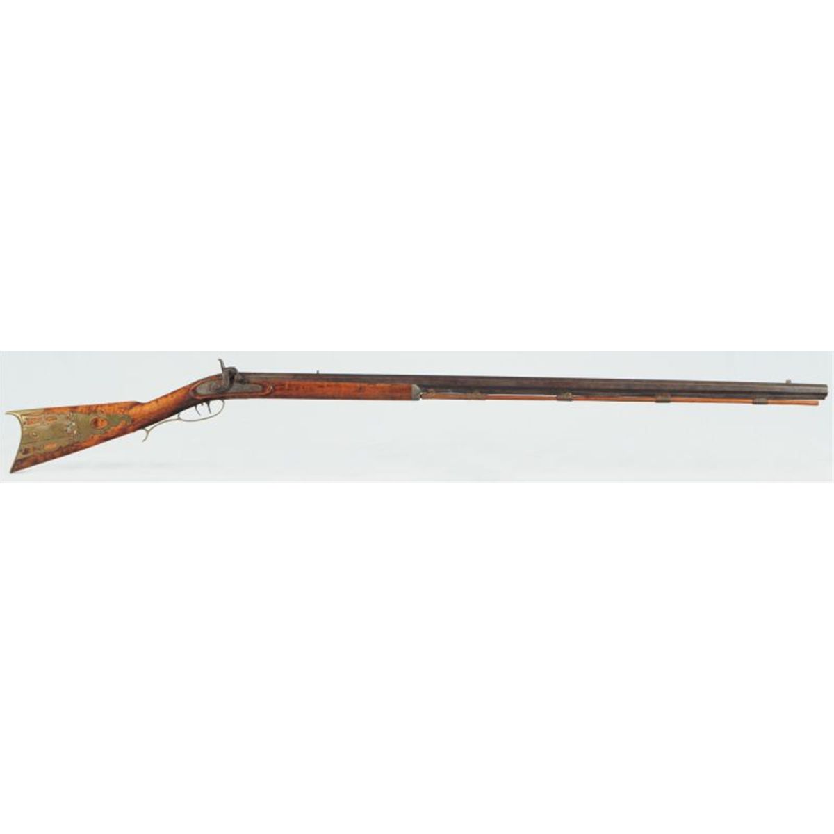 Percussion Rifle, Maker & Caliber Unknown. Large Cal., Double Trigger, Brass Patchwork Box on Stock Trigger Guard and Underbelly, Custom Curved Butt Stock 41" Barrel