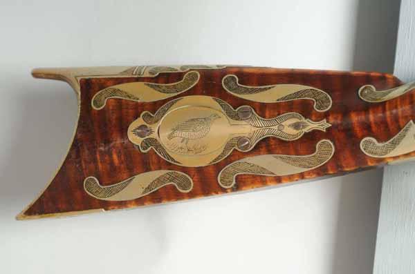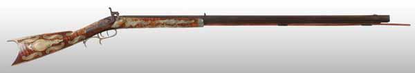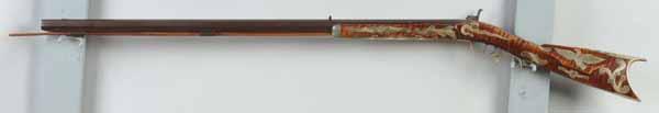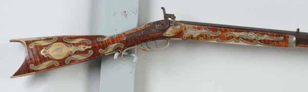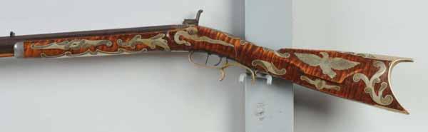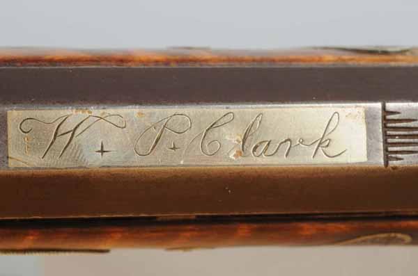 Description Circa 1840 to 1850. OL: 54 - 1/2". BL: 38". TB: Octagonal. LM: Percussion. Original. PB: Oval. S: Curly Maple. 19 silver inlays. This highly ornamented Kentucky half-stock rifle is decorated with 19 German silver inlays and engraving on the oval lid of the patchbox and is signed in a silverplate "W.P. Clark". All of the inlays are heavily cross-hatched with engraving and the back-action locks are marked by Joseph Golcher. The curly maple stock has a warm re-finish with a large spread-winged flying eagle inlaid on the cheekpiece.