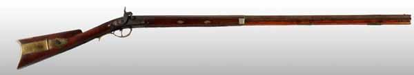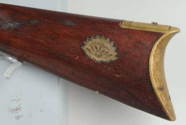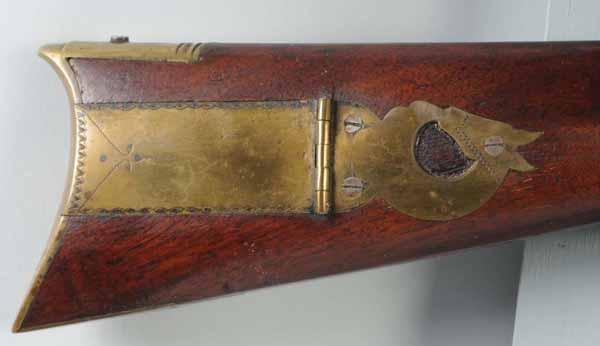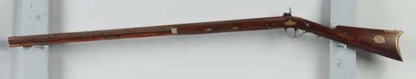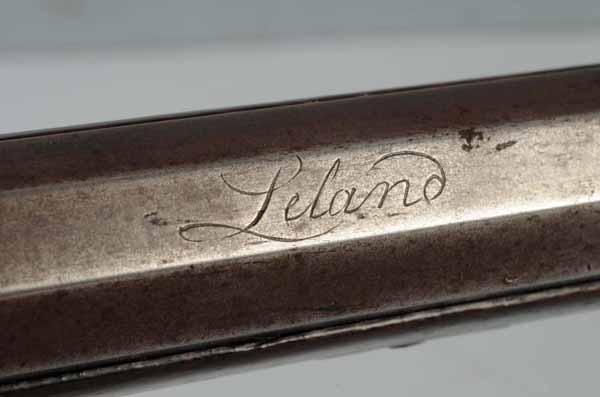 Description Circa 1830 to 1840. OL: 54”. BL: 38 - 1/4”. Original. TB: Octagon to round. LM: Percussion. PB: 2-piece. S: Walnut. One silver inlay and four brass inlays. This rifle, signed “Leland”, is typical New England walnut half-stock fowler with a wooden fore-rib, a simple two-piece patch box, and a floral silvery inlay on the cheek side with “J.E. Adams”, a probable owner, engraved The “horse-head” finial of the patch box is quite pleasing. Condition (Very Good).