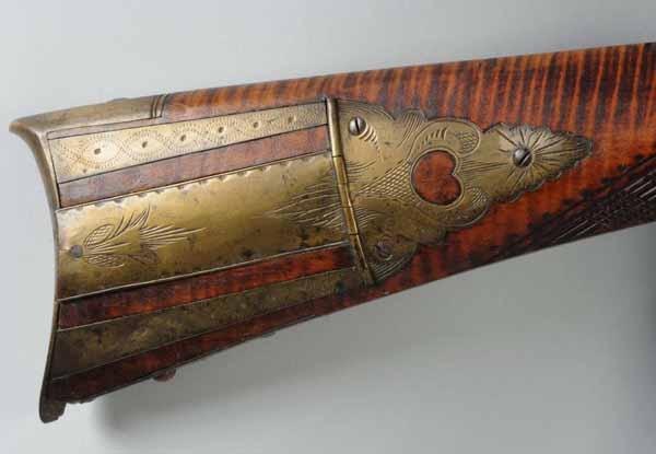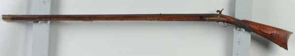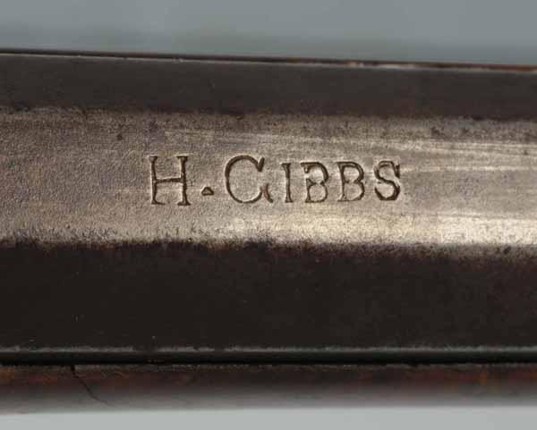 Description Circa 1820 to 1830. OL: 55 - 3/4". BL: 45". TB: Octagonal. LM: Percussion. Original. PB: 4-piece. S: Curly Maple. Incise carving. This late Lancaster rifle, signed "H. Gibbs", was converted from flintlock to percussion and is a pleasant example of his work with a good curly maple stock and "basket-weave" wrist carving as well as an engraved patchbox. The only restoration appears to be a small piece on the left front of the stock behind the nose cap. The signature "H.Gibbs" appears to have been either added or refreshed in modern times. Condition (Good).