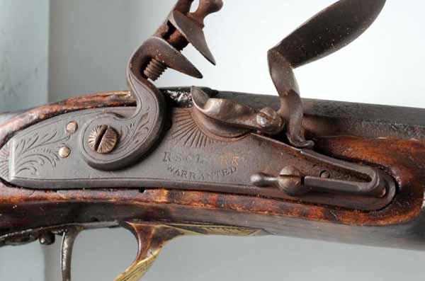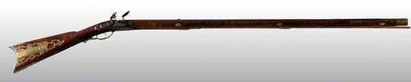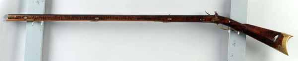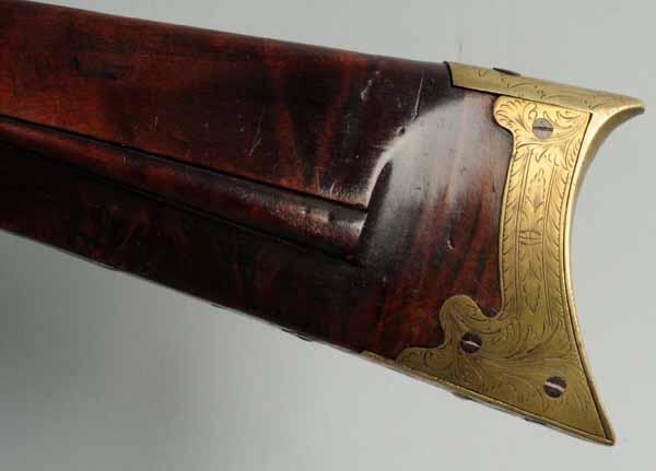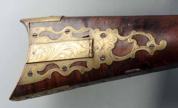 Description Circa 1830 to 1840. OL: 60". BL: 43". TB: Octagonal. LM: Flintlock. Obvious re-conversion. PB: 4-piece. S: Curly Maple. Relief carving. One silver inlay. This Kentucky rifle, with a fully engraved and multiple-pierced brass patchbox may have been made in New York state, but is unsigned. All of the brass metalwork, including a cheek-side plate inlay, are well-engraved. There are wood repairs around the lock area and beside the left tang of the curly maple stock, which has been replaced from the rear ramrod ferrule forward 33 inches to the muzzle of the barrel, which has been lengthened 18 inches. The percussion lock has been converted to flintlock. Condition (Fair).