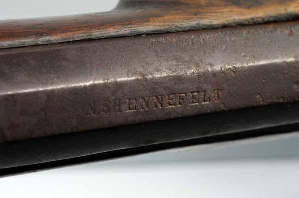 Description Circa 1840 to 1850. OL: 54 - 1/2". BL: 40". TB: Octagonal. LM: Percussion. PB: 4-piece. One silver inlay. The walnut-stocked Kentucky rifle is stamped by Nicholas Shennefelt, who worked in Huntingdon County and then moved to Clarion in the later percussion period. This rifle has a pierced and sparsely engraved patchbox, which is the primary enhancement of his work on this piece. There are no repairs and the rifle has an old finish. Condition (Very Good).