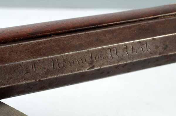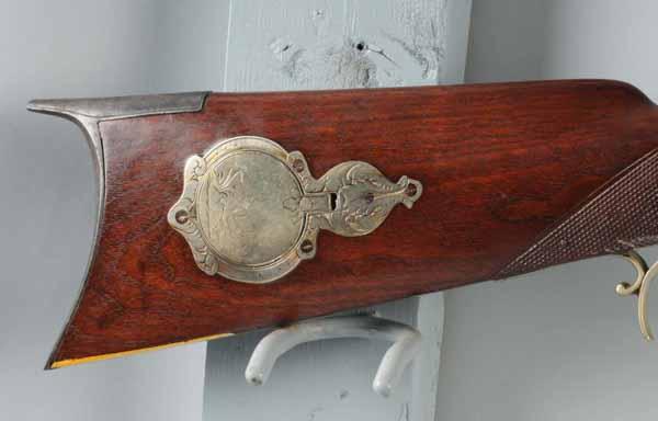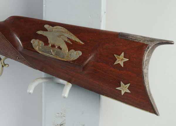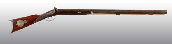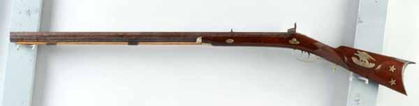 Description OL: 49 - 1/2". BL: 34 - 1/4". TB: Octagonal. LM: Percussion. Original. S: Walnut. Incise carving. Six silver inlays. This Kentucky half-stock rifle is signed "F. Kennedy New York" on the barrel and has mostly German silver mountings with an iron buttplate. There is an outstanding silhouetted eagle inlay on the cheekpiece of the walnut stock with an old re-glue on the left side of the wrist. Condition (Good).