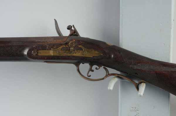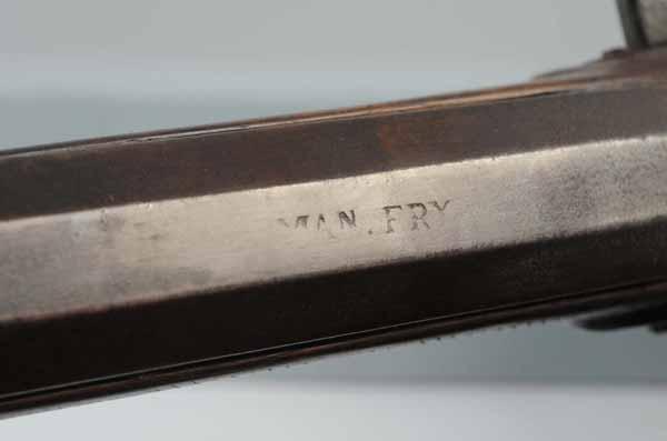 Description Circa 1815 to 1820. OL: 64". BL: 48 - 1/2". TB: Octagon to round. LM: Flintlock. Incise carving. One silver inlay. This Kentucky fowler is stamped "Man Fry" and is fully stocked in walnut. The lock may be original flintlock. The stock has a smooth, dark, later finish. The comb may have been altered later to suit an owner. Condition (Good).