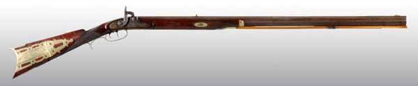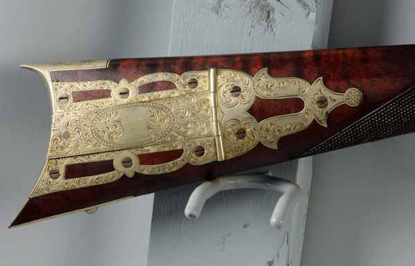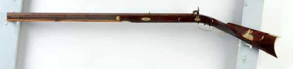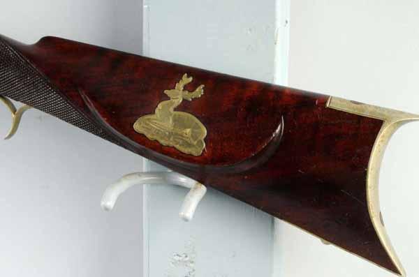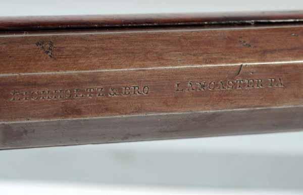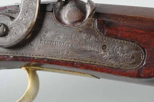 Description Circa 1840 to 1850. OL: 48". BL: 32 - 3/4". TB: Octagonal. LM: Percussion. Original. PB: 4-piece. S: Curly Maple. Incise carving. Four silver inlays. This Kentucky half-stock rifle is fully mounted in German silver and is finely engraved and both the barrel and percussion lock are engraved "Eichholtz and Bros." Lancaster, PA. The walnut stock has most of its original finish and has an attractive silhouetted, resting tag inlaid on the oval cheekpiece and a finely checkered wrist. The percussion lock plate is quite well-engraved. Condition (Very Good).