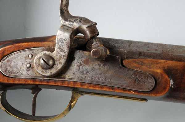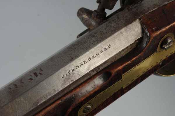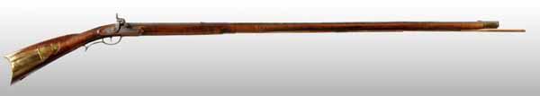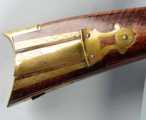 Description Circa 1830 to 1840. OL: 60 - 3/4". BL: 45 - 3/4". TB: Octagon to round. LM: Percussion. PB: 4-piece. S: Curly Maple. Incise carving. This Kentucky rifle is a nice example of a very good condition piece, made in the percussion era, but with features of an early style. The patchbox engraving is very similar to George Feder's work although the barrel is stamped "J. Pennebecker". The gun has its original finish with no restorations and is quite long and graceful. Condition (Very Good).