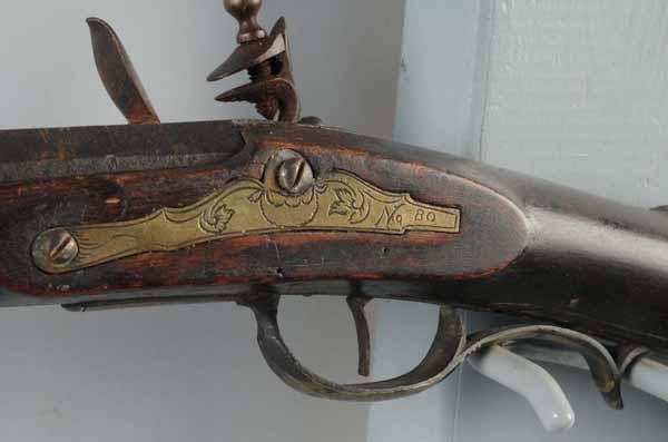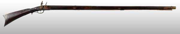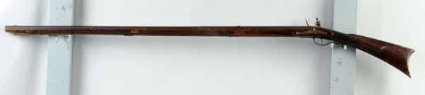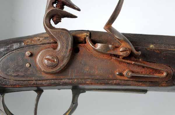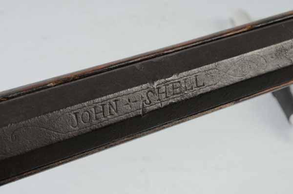 Description Circa 1830 to 1845. OL: 60 - 1/2". BL: 45 - 3/4". TB: Octagon to round. Re-conversion. Six brass inlays. This Kentucky fowler is signed "John Shell" and is engraved "no. 80" on the engraved sideplate. John Shell was the son of Martin Shell, an earlier Kentucky rifle gunsmith. This piece still has its old, dark finish and has a percussion lock, now converted to flintlock. Condition (Very Good).