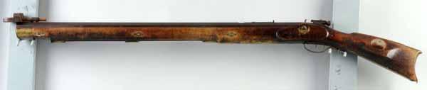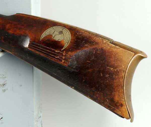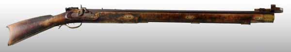 Description OL: 52 - 1/2". BL: 47 - 1/4". TB: Octagonal. LM: Percussion. Original. PB: None. Incise carving. Seven silver inlays. This heavy bench rifle has a nice dry, untouched surface to its curly maple stock. Condition (Very Good).