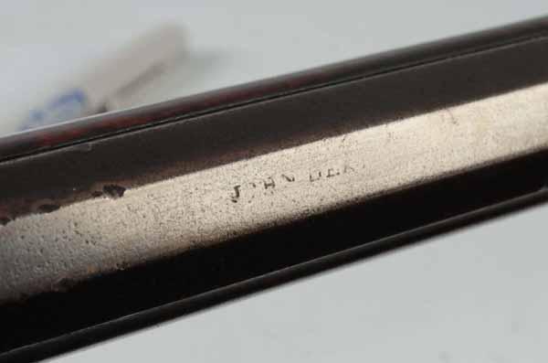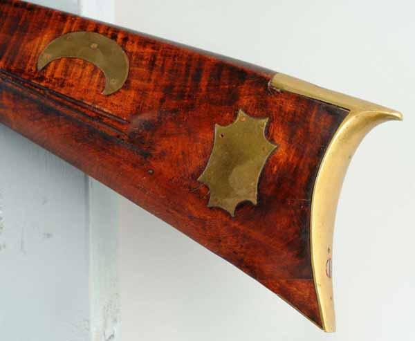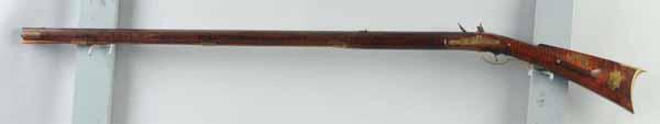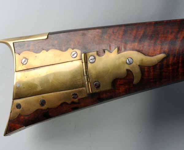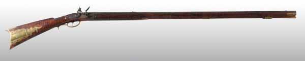 Description Circa 1820 to 1840. OL: 57 - 3/4". BL: 42". TB: Octagonal. LM: Flinlock. Re-conversion. PB: 4-piece. S: Curly Maple. Three brass inlays. This Kentucky rifle is signed "John Derr" and has an exceptionally fine curly maple stock which is all intact. His easily identifiable "flame" finial patchbox design is a classic hallmark of his work. The late flintlock is a re-conversion. Condition (Very Good).