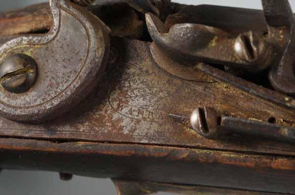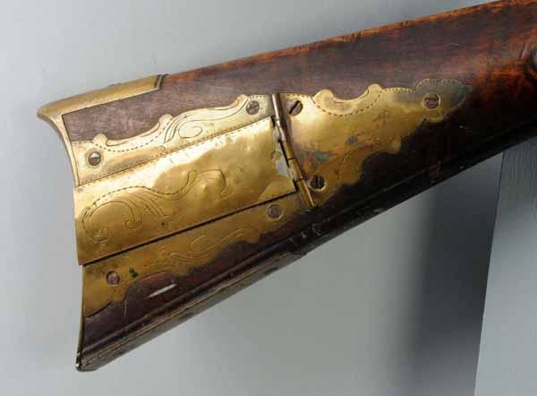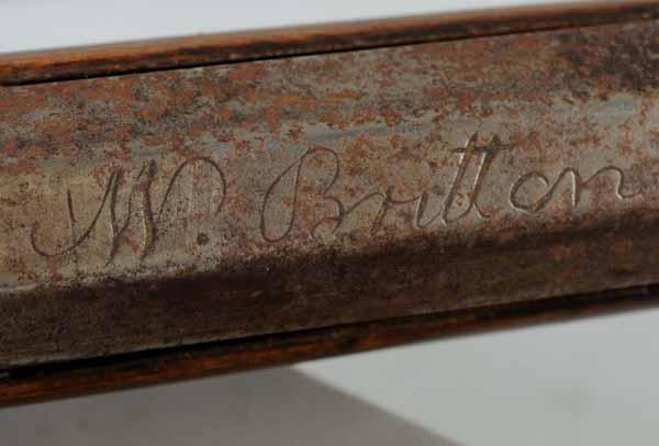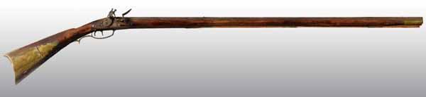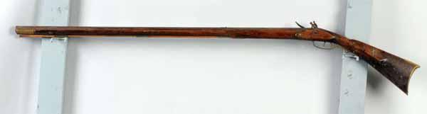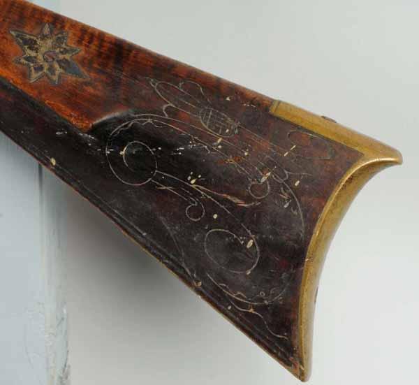 Description Circa 1830 to 1840. OL: 56 - 1/2". BL: 41 - 1/4". TB: Octagonal. LM: Flintlock. PB: 4-piece. Incise carving. One silver inlay. This Kentucky is signed "William Britton" of Hampshire County, Virginia and is in "as-found" condition with breaks and cracks in the stock. This rifle has incised typical pattern of the Winchester School as well as wrist carving and its original old surface. The brass patchbox engraving is typical of his work. The rifle has a percussion lock, probably replaced, which is now converted to flintlock. Condition (Good).