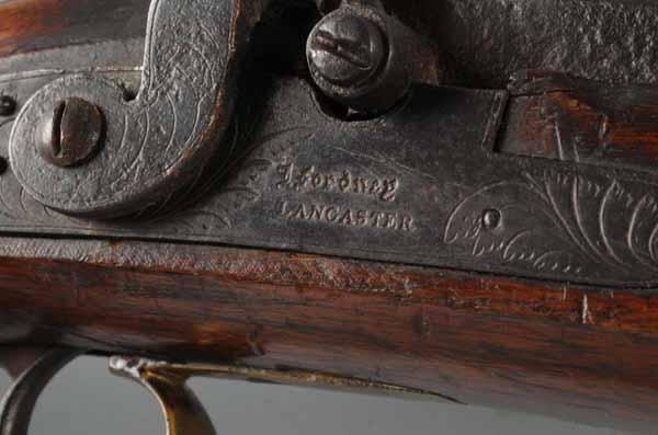 Description Circa 1830 to 1840. OL: 48 - 1/2". BL: 33". TB: Octagon. LM: Percussion. PB: None. S: Walnut. The well-made walnut stocked bench rifle is marked "D. Fordney Lancaster" both on the percussion lock and the heavy octagonal barrel. Condition (Very Good).