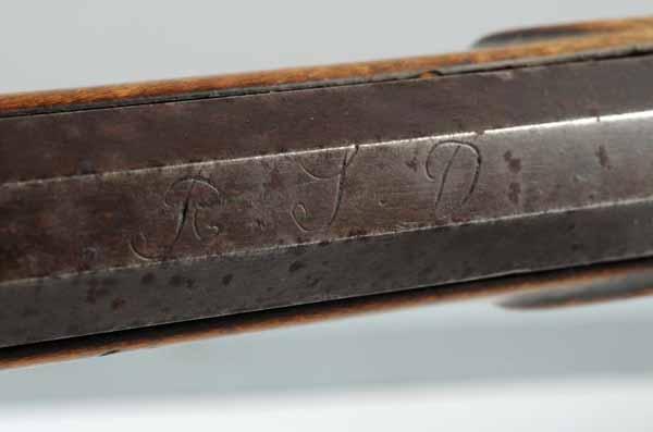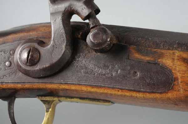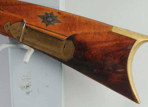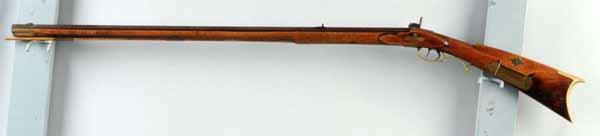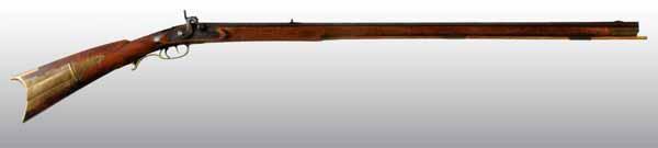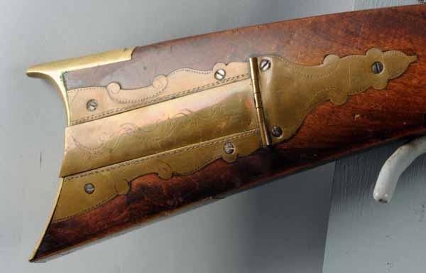 Description OL: 51 - 1/2". BL: 36 - 1/4". TB: Octagonal. LM: Percussion. PB: 4-piece. One silver inlay. This West Virginia Kentucky rifle is signed in script "RSD" with a typical engraved "acorn finial" patchbox and an engraved "cap box" beneath the cheekpiece. This rifle has survived in very good condition having a warm amber and black patina and architecturally quite sound. Condition (Very Good).