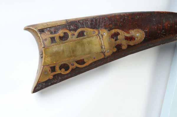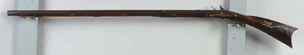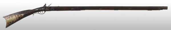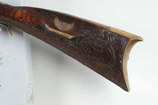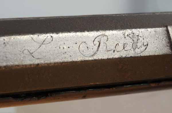 Description Circa 1820 to 1830. OL: 58 - 3/4". BL: 43". TB: Octagon to round. LM: Flintlock. Replaced. PB: 4-piece. S: Curly Maple. One brass inlay and two silver inlays. This signed "L. Reedy" rife is a rarity because very few were signed. This rifle has an exceptional pierced, patchwork and elongated pierced toe-plate, in addition to a comb-plate and fore-arm "wearplate". The rifle has Reedy's classic carving pattern behind and in front of the cheek piece, although there is no tang carving. The barrel tang has been lengthened and lock itself is a modern replacement as is the forestock from the rear ramrod ferrule forward. However, the 43-inch octagonal to round barrel, although lightly pitted is its original length. Otherwise the original wood from the rear ferrule back to the buttplate has an original finish and the newer forestock has been colored/finished to match. Condition (Good).