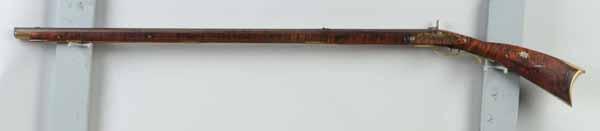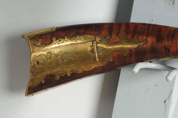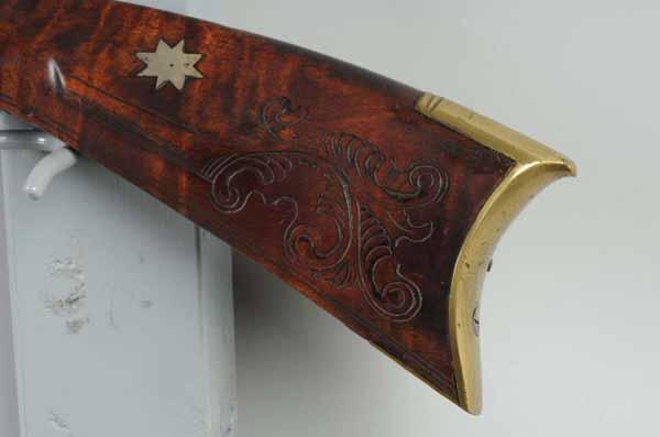 Description Circa 1815 to 1825. OL: 56". BL: 41". TB: Octagonal. LM: Percussion. Replaced in-period. PB: 4-piece. S: Curly Maple. Incise carving and two silver inlays. This unsigned Kentucky rifle is easily attributed to Adam Angstadt as the patchbox and its classic attractive engraving is a hallmark of his work. The incised carving behind the cheekpiece of this curly maple stock is also a signature of his work along with a scalloped, elongated toe-plate. The rifle was originally a flintlock but is now in a percussion state with its "in-period" replaced percussion lock. The pleasing curly maple stock has no repairs and excellent architecture. Condition (Very Good).
