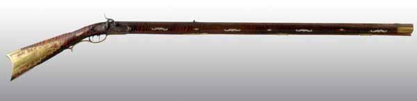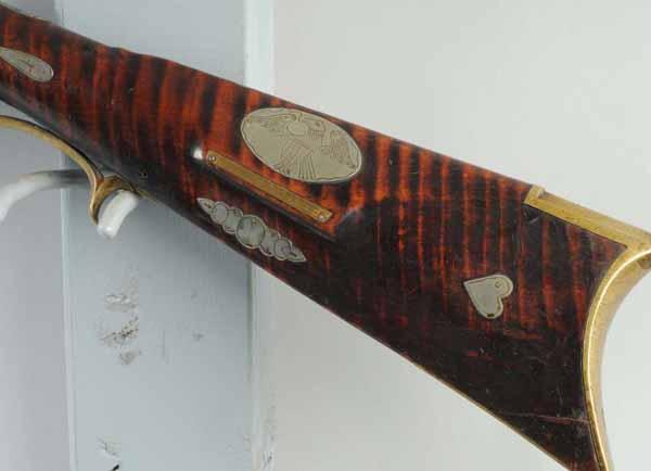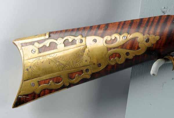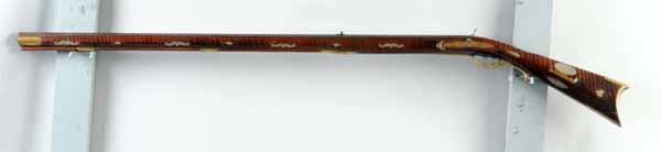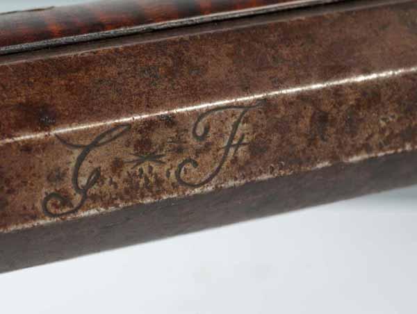 Description Circa 1830 to 1840. OL: 56 - 1/2". BL: 42 - 1/2". TB: Octagonal. LM: Percussion. PB: 4-piece. S: Curly Maple. 21 silver inlays. This Kentucky rifle is signed "G.F." in script and may be George Flowers' work. With the exception of a tiny sliver on the left upper forestock, this strong curly maple stock has fine condition with multiple inlays and a finely pierced and engraved patchbox. Its percussion, engraved hammer is related to the Bedford County school and is quite exceptional in its appearance. Condition (Very Good).