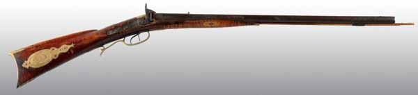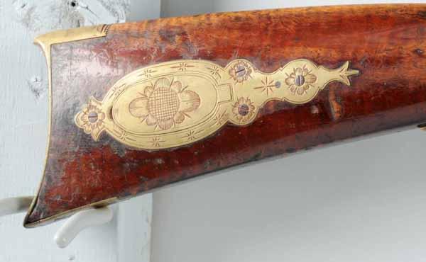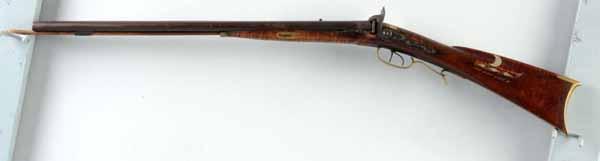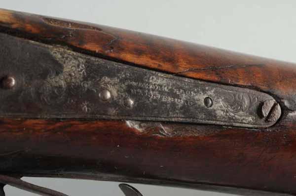 Description OL: 40”. BL: 25”. TB: Round. LM: Percussion. PB: Oval. S: Curly maple. Incise carving. Four silver inlays. This “double” Kentucky rifle is very small in size but has a normal 13 inch trigger pull, which does not preclude it from being a “boy’s or lady’s” gun. However, it may be a saddle or carriage gun as well. The curly maple stock has its original finish and the gun is in its “as-found”, untouched condition. The Kelker Bros. back-action locks are original and the right barrel is rifled while the left is smooth. The oval patchbox, silver inlays, and brass hardware are completely engraved. Although made during the muzzle-loading period, this is an uncommon piece and is very desirable due to its small size and good condition. Of special note, the engraving is filled in with red (rather than black) rouge. Condition (Very Good)