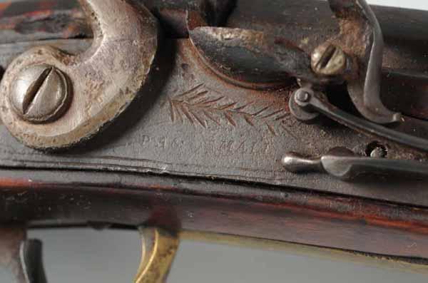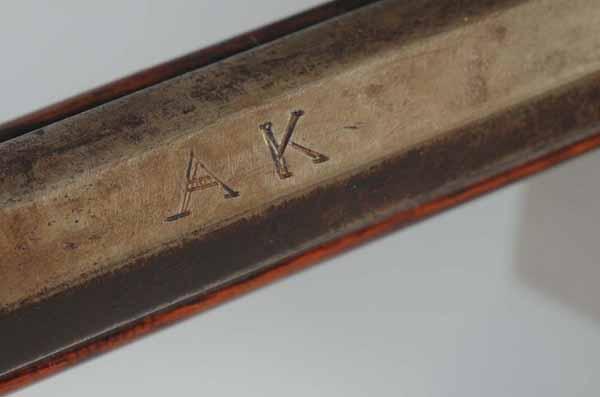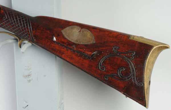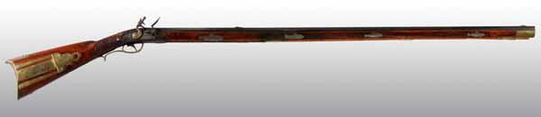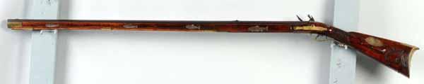 Description Circa 1815 to 1825. OL: 57 - 3/4". BL: 42 - 1/4". TB: Octagonal. LM: Flintlock. Obvious re-conversion. PB: 4-piece. S: Curly Maple. Incise carving. Ten silver inlays. This Kentucky rifle is signed "A.K." which would be York County's Andrew Kleindinst. The maple stock has a very nice incised carved pattern behind the cheekpiece which is very similar to J. Welshans, as is the wrist basket-weave carving. The upper 26 inches of the forestock are restored but the octagonal barrel appears to have its original length. The lock is an obvious re-conversion. There are a number of original silver inlays including fish and an eagle engraved cheekpiece inlay along with a desirable "bird preening its feathers" patchbox finial. Condition (Good).