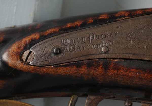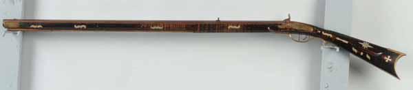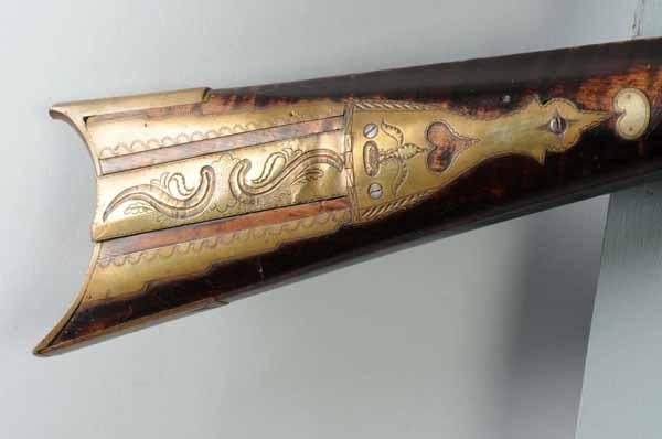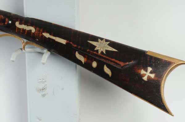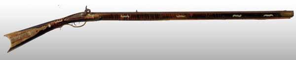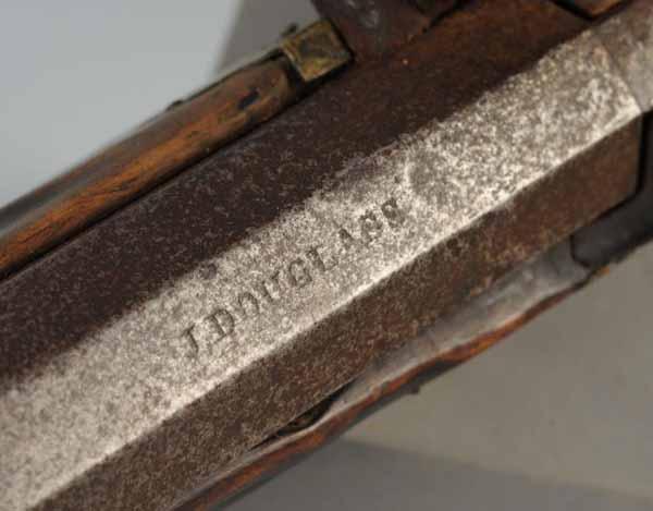 Description OL: 51 - 1/2". BL: 36 - 1/4". TB: Octagonal. LM: Percussion. Original. PB: 4-piece. S: Curly Maple. 18 Silver inlays. This signed "J. Douglas" Kentucky rifle is a classic example of the later Huntington County rifle-making group. The all original stock still has its old surface with a fine curly maple and all of the 18 silver inlays still intact. Condition (Very Good).