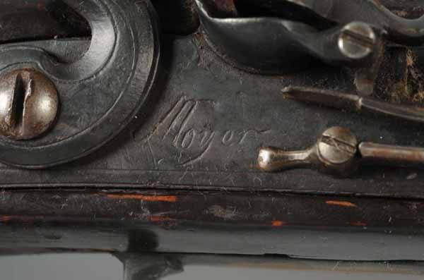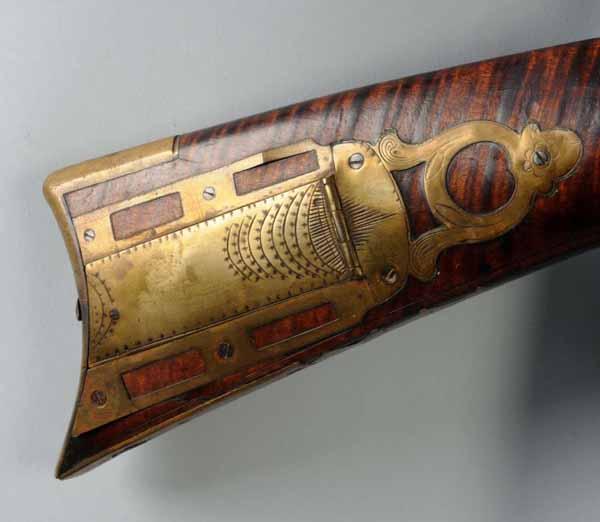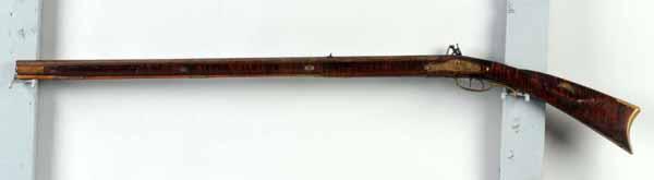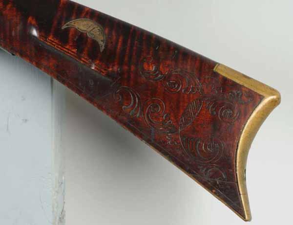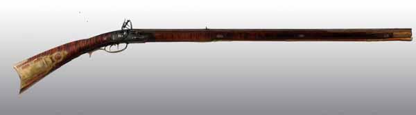 Description Circa 1830 to 1840. OL: 51 - 1/2". BL: 35". TB: Octagonal. LM: Flintlock. Obvious re-conversion. PB: 4-piece. S: Curly Maple. Incise carving. Eight silver inlays. This Kentucky is a signed "S.S." and is an Upper Susquehanna rifle which has a typical, nicely engraved patchbox along with the normal incised carving behind the cheekpiece. The strong curly maple stock has an old surface and only two patches fore and aft of the lock. Condition (Good).