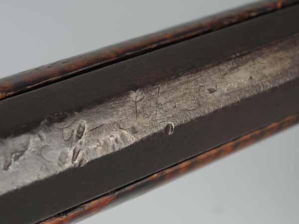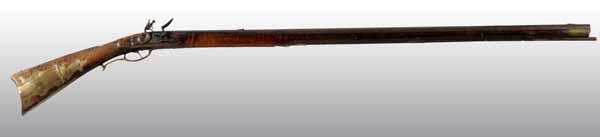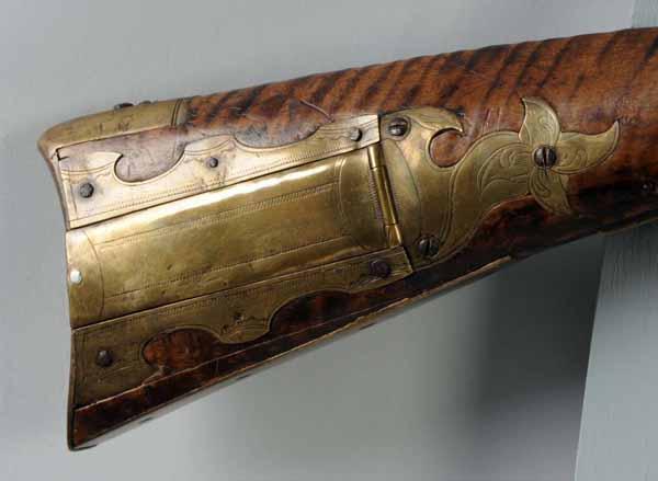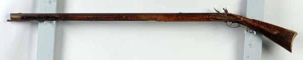 Description Circa 1830 to 1840. OL: 58 - 1/4". BL: 43 - 1/2". TB: Octagonal. LM: Flintlock. Obvious re-conversion and replaced. PB: 4-piece. S: Curly Maple. SR: One patched area. This Kentucky rifle, stocked in good curly mpale with an old surface, is signed by George Schroyer; however, it is another example of an "in-period" re-stock. With the exception of the replaced flintlock and a wood patch above the front of the lock, it is in good "untouched" condition, with a very pleasing patchbox, typical of George Schroyer, who was a well-known Hanover, York County PA gunsmith. Condition (Very Good)